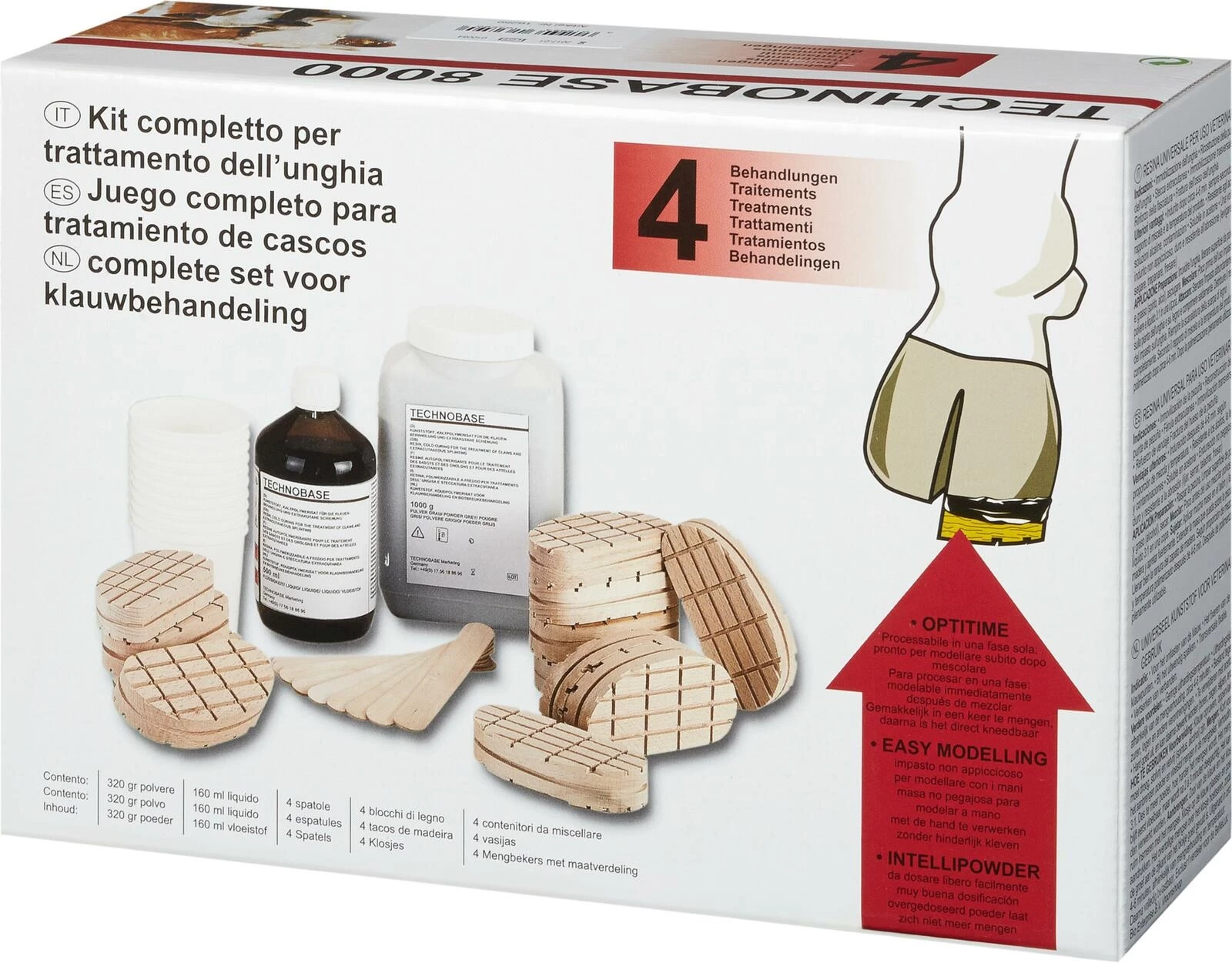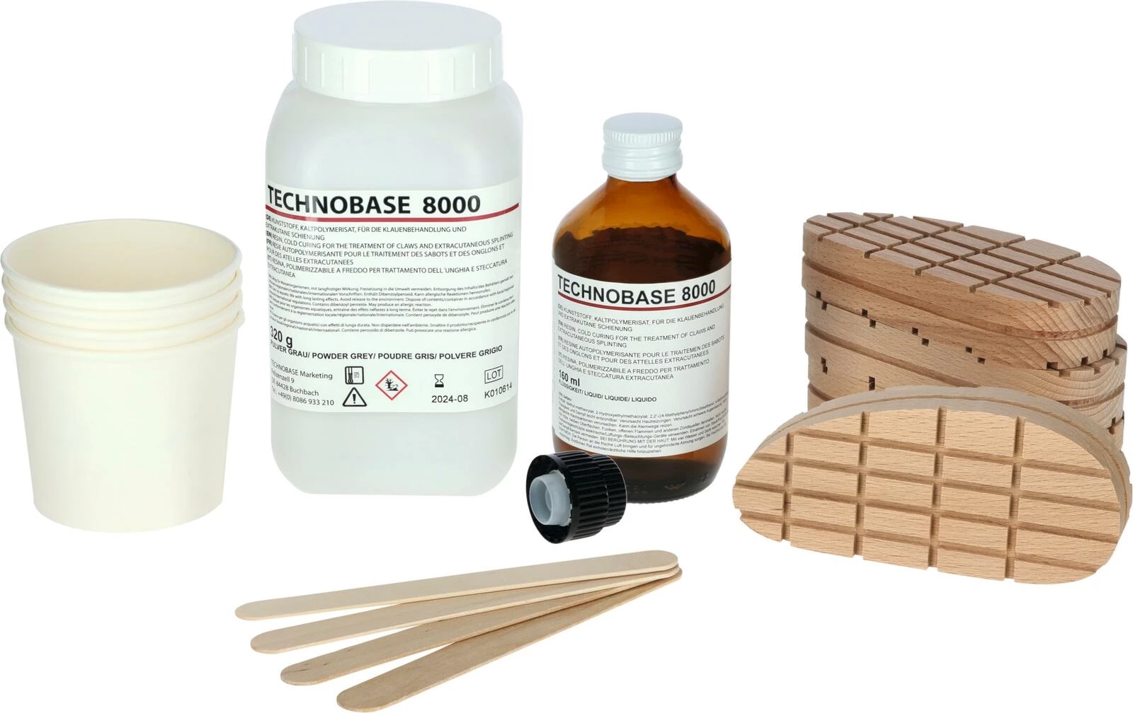 Le système de traitement des onglons Technobase est adapté aux onglons malades ou blessés. Il peut être modelé juste après le mélange et durcit en moins de 4 minutes lorsque la température du produit est de 20 °C. Vous pouvez ainsi être certain que les onglons malades sont soulagés de manière optimale jusqu’à usure du patin en bois. La pâte peut encore être formée et manipulée de manière flexible jusqu’à la polymérisation finale. Le paquet convient pour 4 applications.
