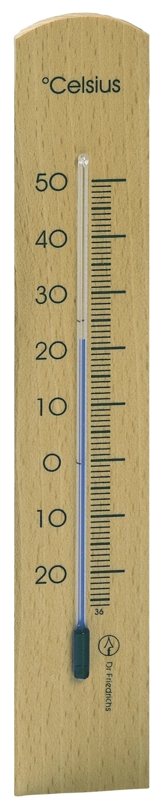 Pour l'intérieur. Hêtre de couleur naturelle. Plage de mesure : -20 et +50 °C. Dimensions : 26 × 7 × 1,8 cm.