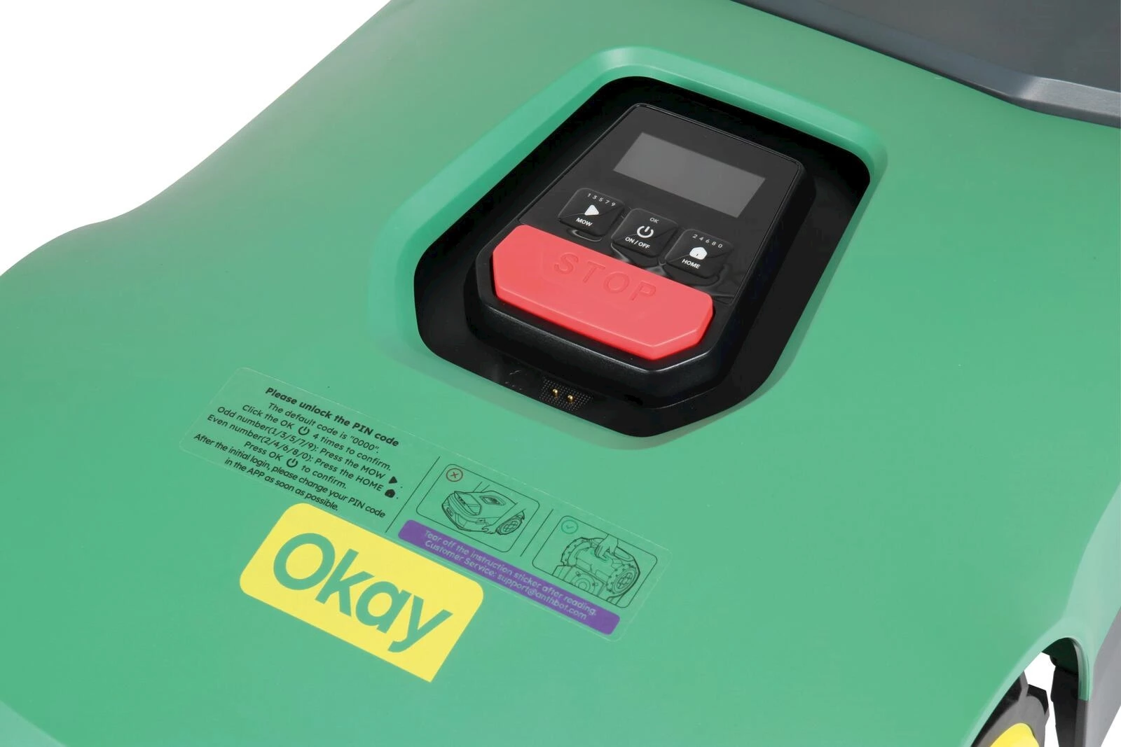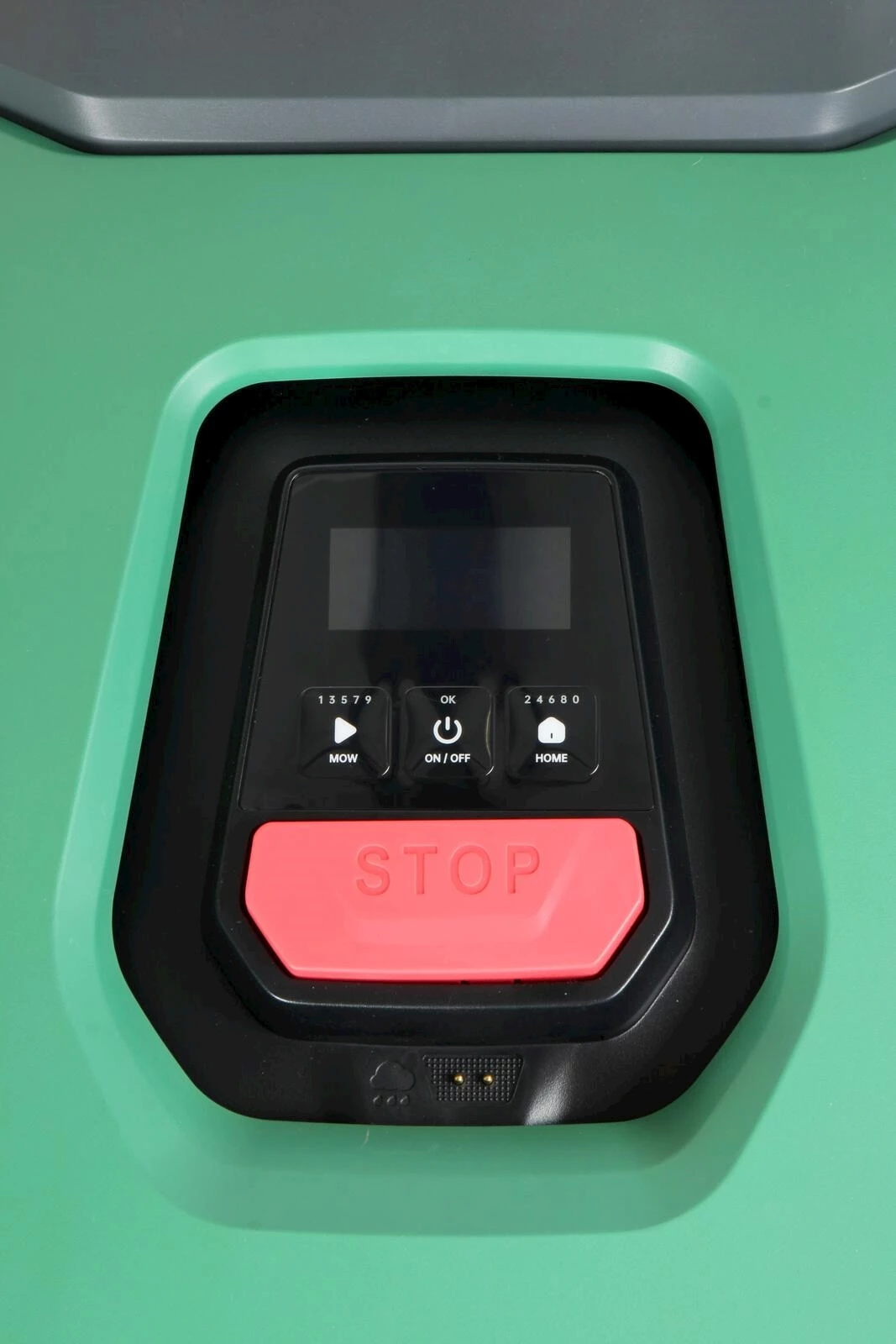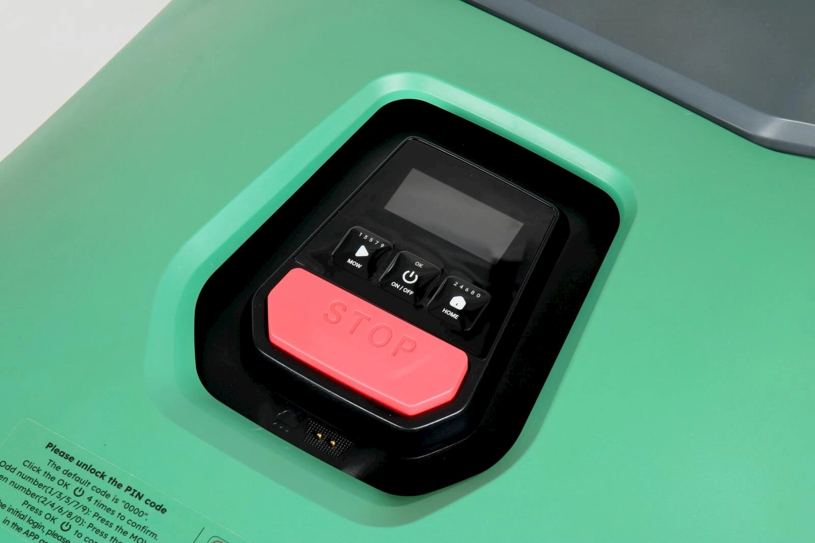 Okay. Commande et programmation via une application. Antenne GPS RTK, capteur de pluie et station de recharge inclus. Surface jusqu'à 2 000 m². Pente jusqu'à 45 %. Avec 4 caméras et vision 3D pour une tonte intelligente.