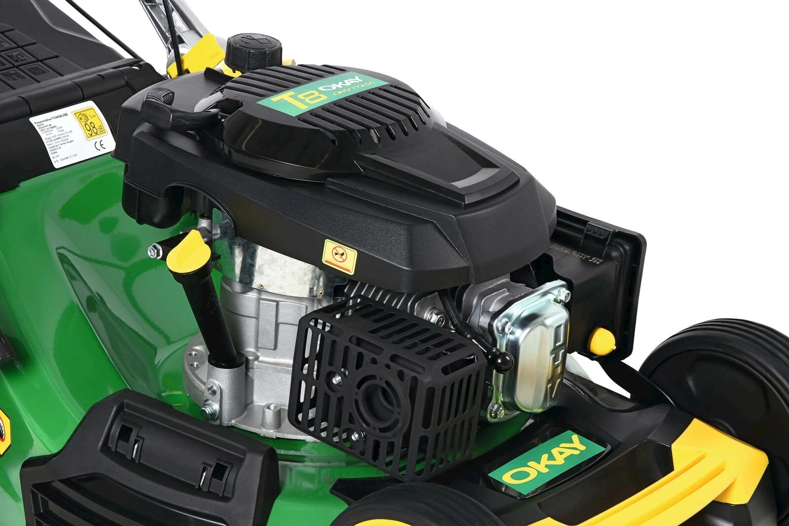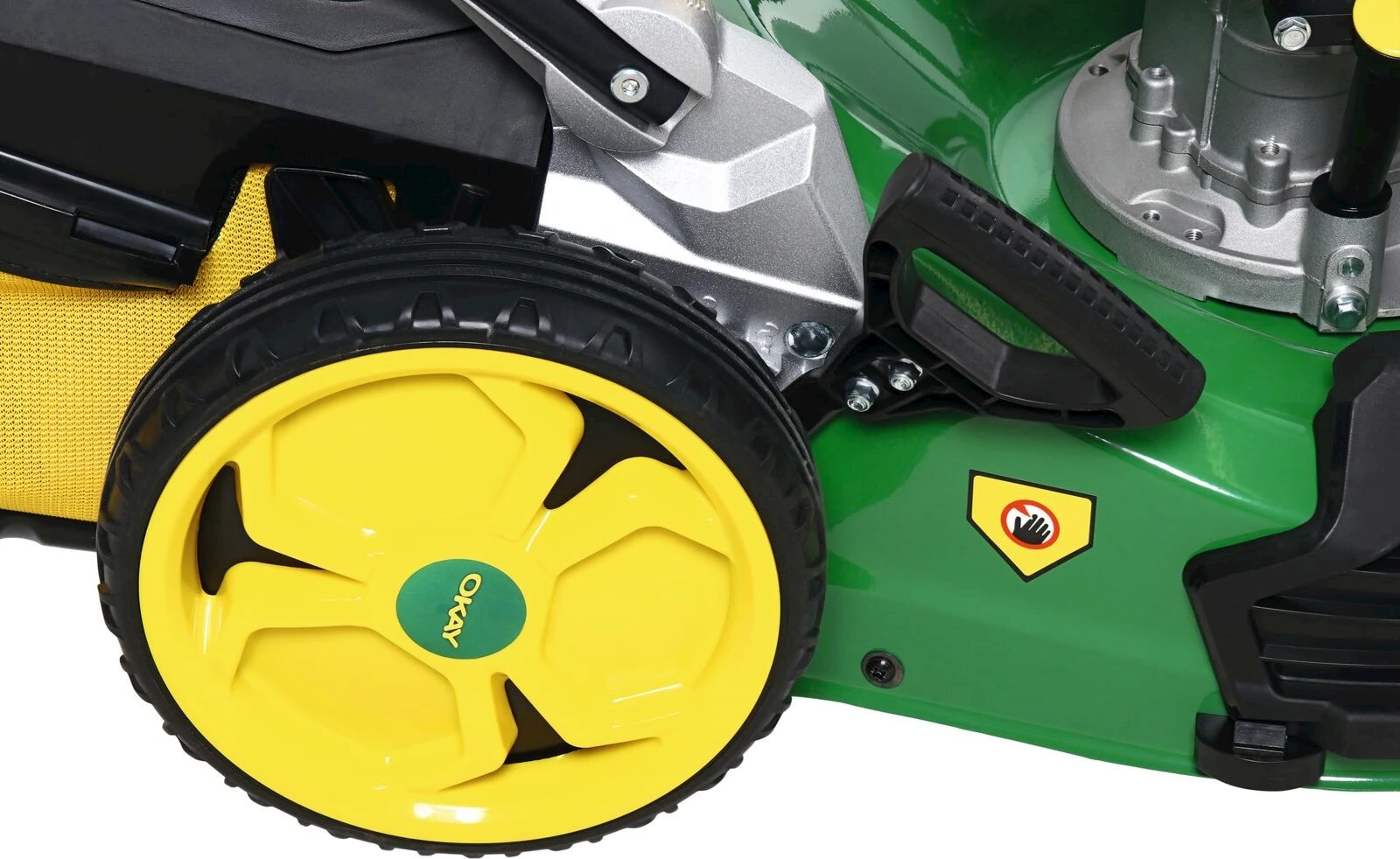 High Wheeler avec roue motrice. Boîter en acier. Fonction 3-en-1 : Paillage, éjection arrière et latérale. Utiliser jusqu’à une surface de 2000 m². Non-monté.
