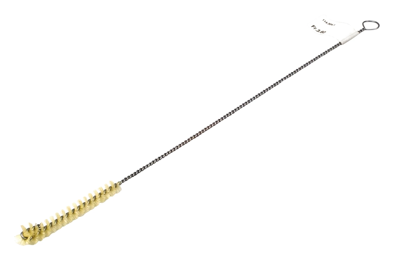 La brosse pour robinets a une tête spirale avec des poils clairs et le fil est galvanisé. Longueur : 34 cm. Diamètre : 1 cm.