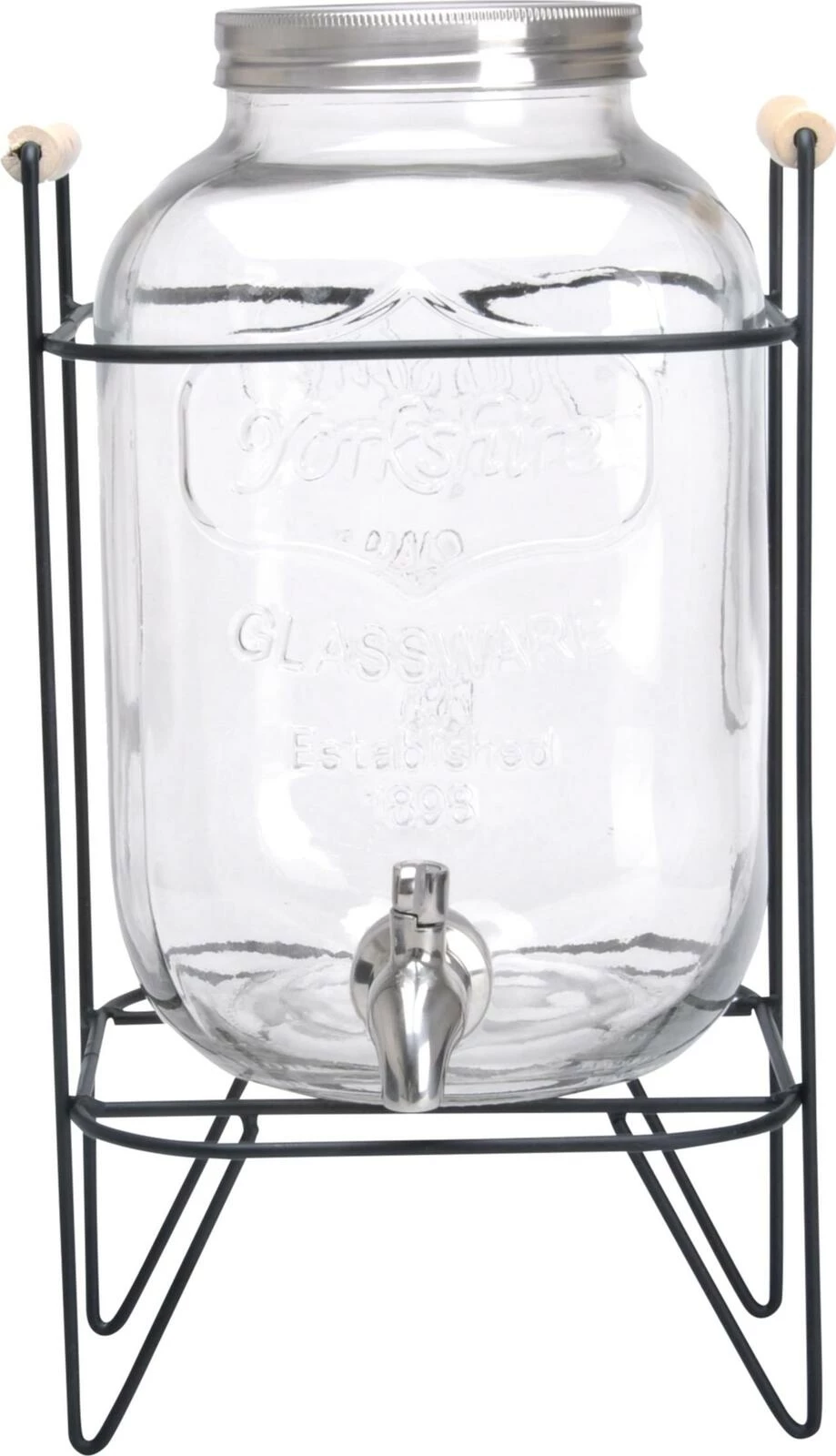 L'élégant distributeur de boissons d'une capacité de 5 litres offre suffisamment de place pour les boissons rafraîchissantes comme l'eau, les jus de fruits, les sodas ou les boissons chaudes comme le vin chaud. Les boissons peuvent être tirées sans effort grâce au robinet pratique, sans avoir à ouvrir constamment la bouteille. Avec son look rétro, le distributeur de boissons confère un aspect élégant qui s'intègre parfaitement dans chaque environnement. Le récipient en verre résiste aux odeurs et aux transferts de goût et préserve la fraîcheur de vos boissons. Le pied stable en acier assure une bonne stabilité. Avec sa capacité de 5 litres, le distributeur de boissons est parfaitement adapté aux fêtes, aux célébrations ou à la vie quotidienne avec des enfants. Le récipient en verre est facile à nettoyer au lave-vaisselle. Dimensions : 27 × Ø17 cm. Poids : 2 kg.