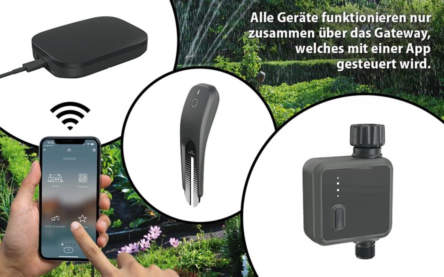 Das ist einer der grossen Pluspunkte. Das Gateway selbst steht im Haus nahe beim Router und hat gutes WLAN. Die Verbindung vom Gateway zu den Geräten im Garten erfolgt über eine spezielle Funkfrequenz (RF). Diese Frequenz hat eine deutlich höhere Durchdringungskraft und Reichweite als normales WLAN, weshalb das System auch in grossen Gärten sehr zuverlässig funktioniert.