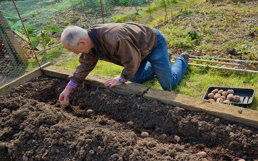 Füllen Sie die Furche vorsichtig mit Erde auf, sodass die Knollen gut bedeckt sind.