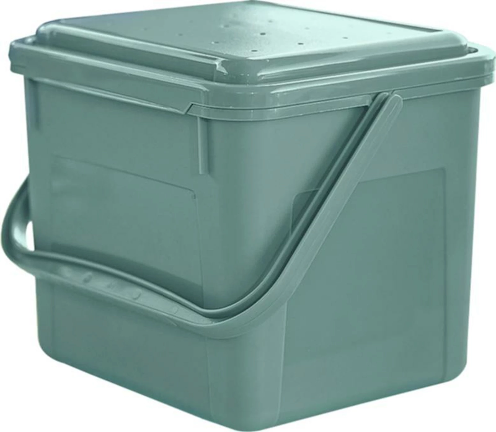 Der grüne Komposteimer aus Polypropylen hat einen geruchsdichten Deckel. Er ist handlich und kompakt. Das Füllvolumen beträgt 5 Liter. Masse: 21 × 20 × 18 cm.