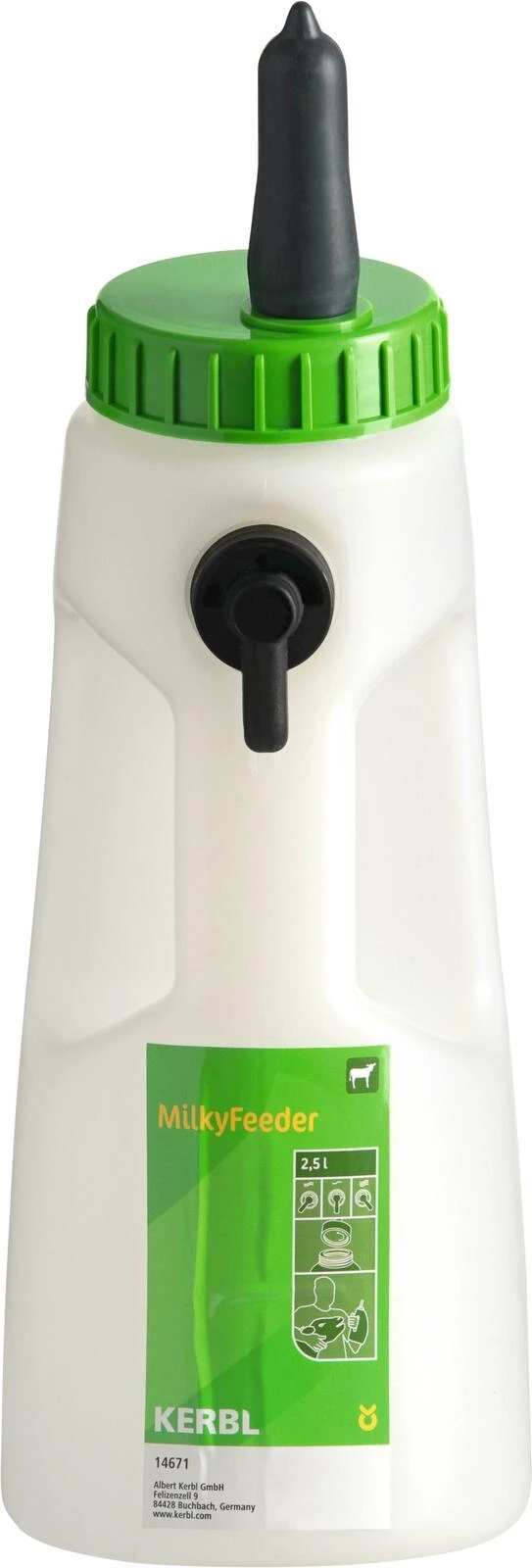 Die Milchflasche für Kälber MilkyFeeder ist mit einem 3-Stufen-Ventil zur Einstellung der Tränkegeschwindigkeit ausgestattet. Helfen Sie so Ihrem Kalb, die Milch in natürlicher Geschwindigkeit zu trinken und so eine gute Verdauung sicherzustellen. Die Aufzuchtflasche wird mit einem Sauger geliefert. Mit Schraubverschluss und Füllskala (in l, qt.). Inhalt: 2,5 Liter.