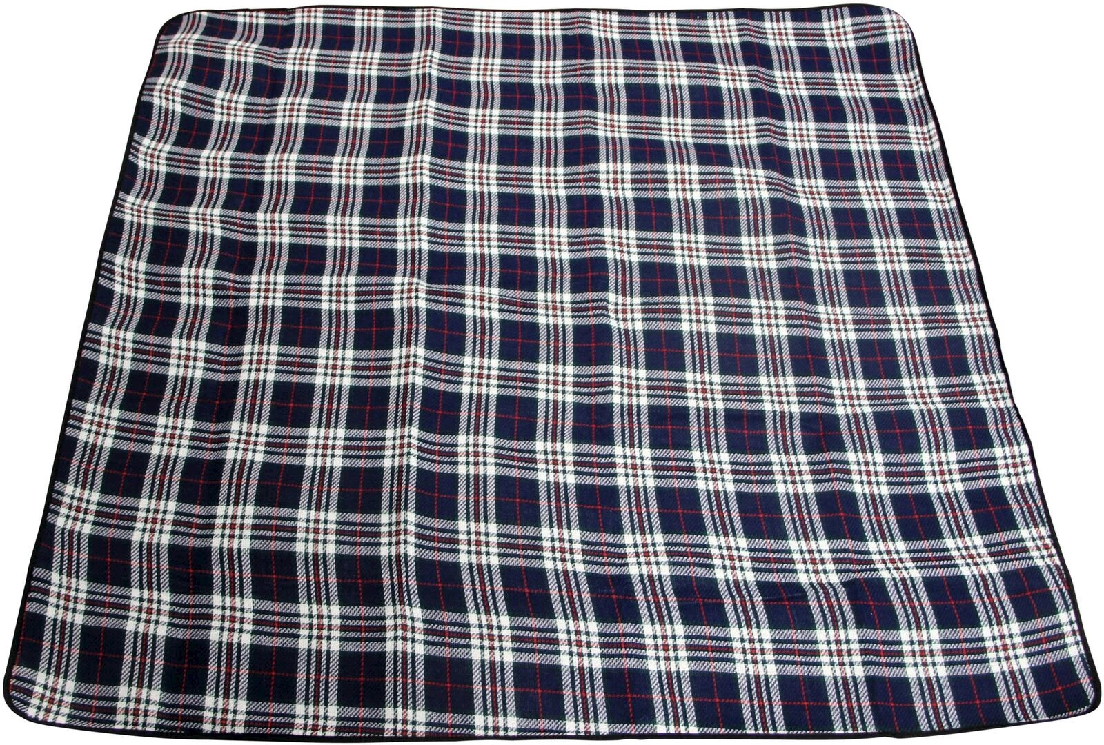 Grossflächige Picknickdecke. Material: Polyester und Schaumstoff. Farbe: Schwarz mit Tartanmuster. Masse: 150 × 150 cm.