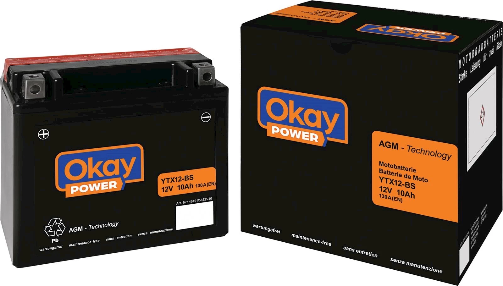 Die leistungsstarke Okay Power Motobatterie mit 120 Wh / 10 Ah bei 12 V und AGM-Technologie. AGM steht für Absorbent Glass Mat, was bedeutet, dass der Elektrolyt in der Batterie mit Vlies und Glasfaser gebunden ist, was einen maximalen Auslaufschutz sicherstellt. Geeignet für Motorräder und Roller. Die 12V Motorradbatterie verfügt über hohe Startkraft und Kapazität mit genügend Sicherheitsreserve und geringer Selbstentladung. Längere Zyklenlebensdauer. Wartungsfrei nach EN.
