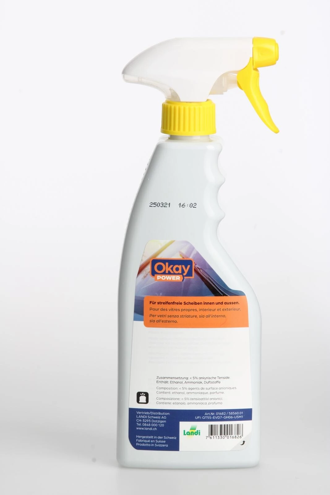 Im 500 ml PE-Kanister für eine streifenfreie Scheibenreinigung innen sowie aussen. Im Lieferumfang sind 500 ml hellgrünes Scheibenwasser Okay Power enthalten. Vor dem Gebrauch sollte das geschüttelt werden, anschliessend können die Scheiben einsprüht und mit einem trockenen Tuch oder Papier trocken gerieben werden.