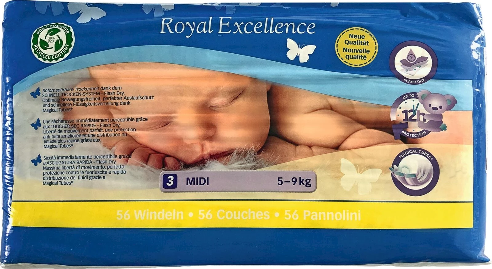 Die Royal Excellence Midi Windeln sind für Babys zwischen 5 – 9 kg geeignet. Die Windel hat eine sofort spürbare Trockenheit, dank dem Schnell-Trocken-System Flash Dry. Eine spezielle Verteilerlage leitet und verteilt Flüssigkeit effektiv im Windelkern und sorgt dafür, dass noch weniger Feuchtigkeit zurück an die Oberfläche gelangen kann – für eine sofort spürbare und langanhaltende Trockenheit. Die Windeln verleihen dem Kind eine optimale Bewegungsfreiheit und hat einen Sicherheits-Klettverschluss für besseren Halt beim Wiederverschliessen. Sie sorgen für einen Auslaufschutz bis zu 12 Stunden und haben eine superschnelle Flüssigkeitsverteilung dank der Magical Tubes® Saugkörper-Technologie. Die Windel ist dermatologisch getestet, naturlatex-frei sowie chlorfrei gebleicht. In einer Packung sind 56 Windeln enthalten.