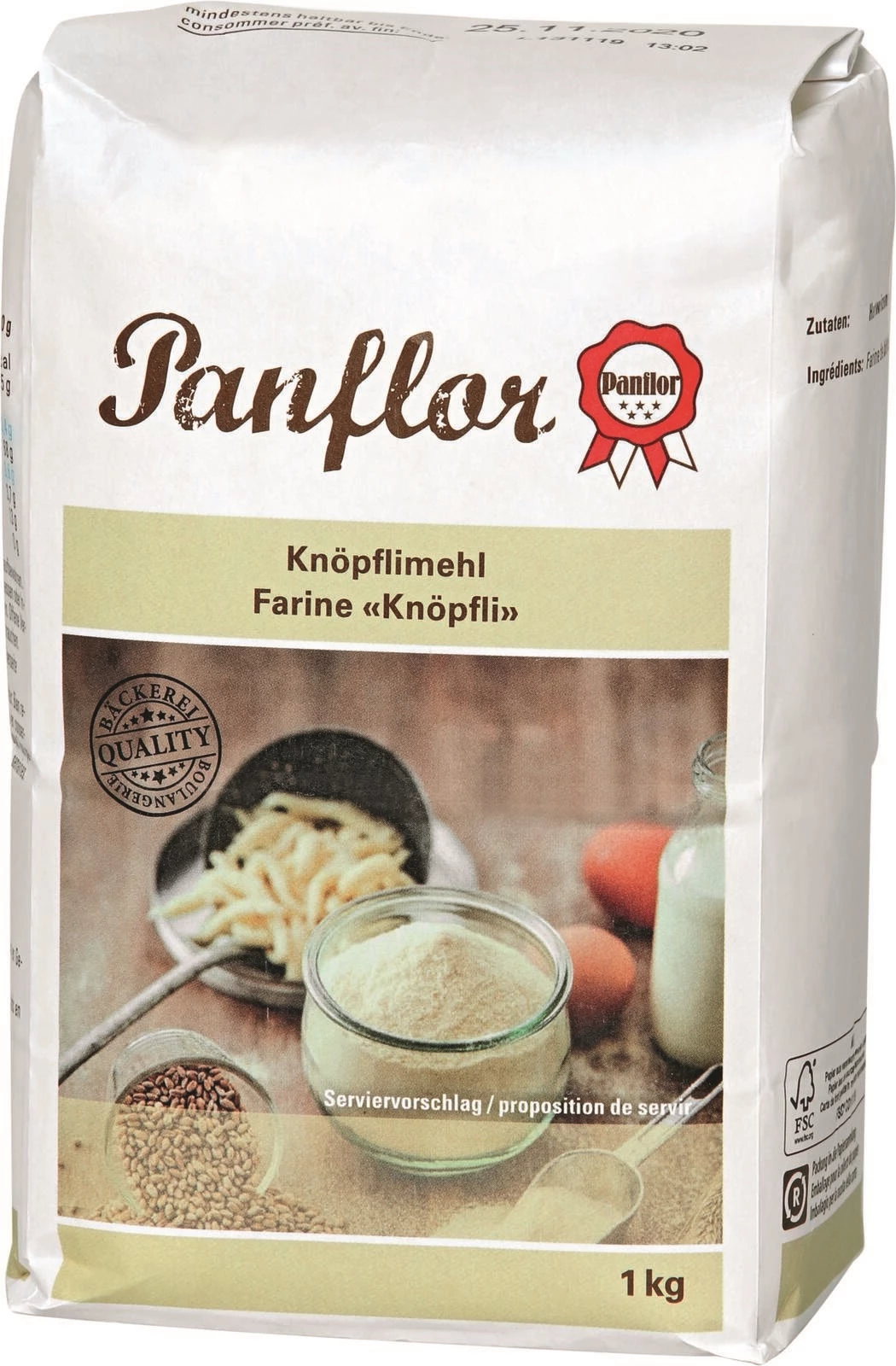 Das Panflor Knöpflimehl wird aus HartWEIZENgriess hergestellt. Die Zubereitung von fenen Chnöpfli oder Spätzli / Spätzle mit Panflor Knöpflimehl ist denkbar einfach, insbesondere wenn man ein Knöpflisieb oder Spätzlepresse verwendet. Der angerührte zähflüssige Teig wird über das Knöpfliesieb direkt ins kochende Salzwasser gestrichen. Wenn man kein Knöpflisieb zur Hand hat, kann man sich auch mit einem Lochblech oder einer groben Reibe behelfen.