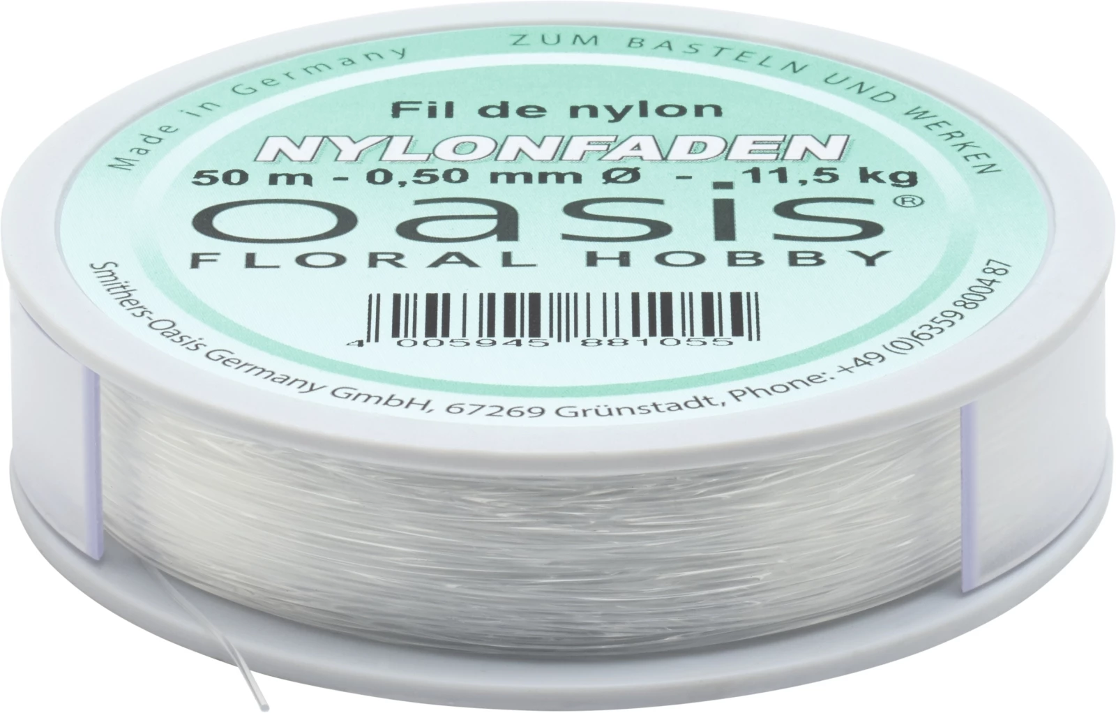 Durchsichtiger Faden aus Nylon auf Spule, ideal zum Basteln oder Deko-Artikel aufzuhängen. Durchmesser: Ø 0,5 mm. Länge: 50 m. Farbe: transparent.