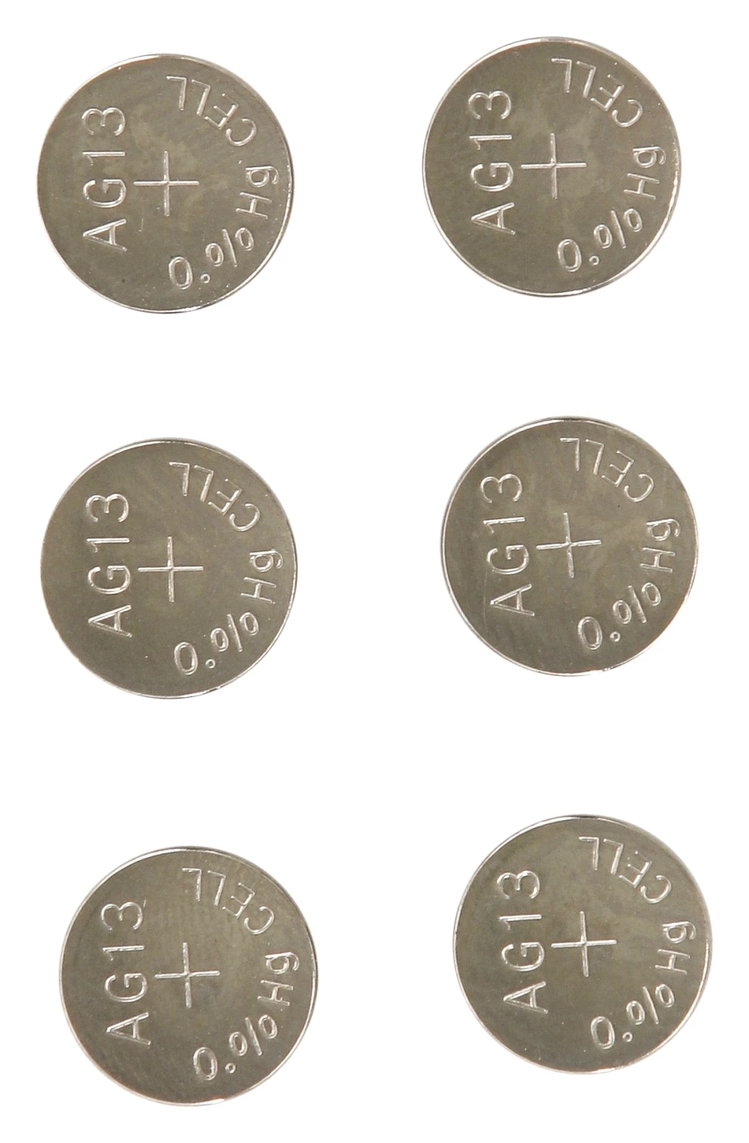 6 Stk. 1.5 Volt LR44 Knopfzellenbatterien bestehend aus Metall, Zinkpulver und Mangandioxid, mit einer Kapazität von 155 mAh für die Anwendung in Autoschlüsseln, Taschenrechner, Thermometern und sonstigen Kleinelektrogeräten.