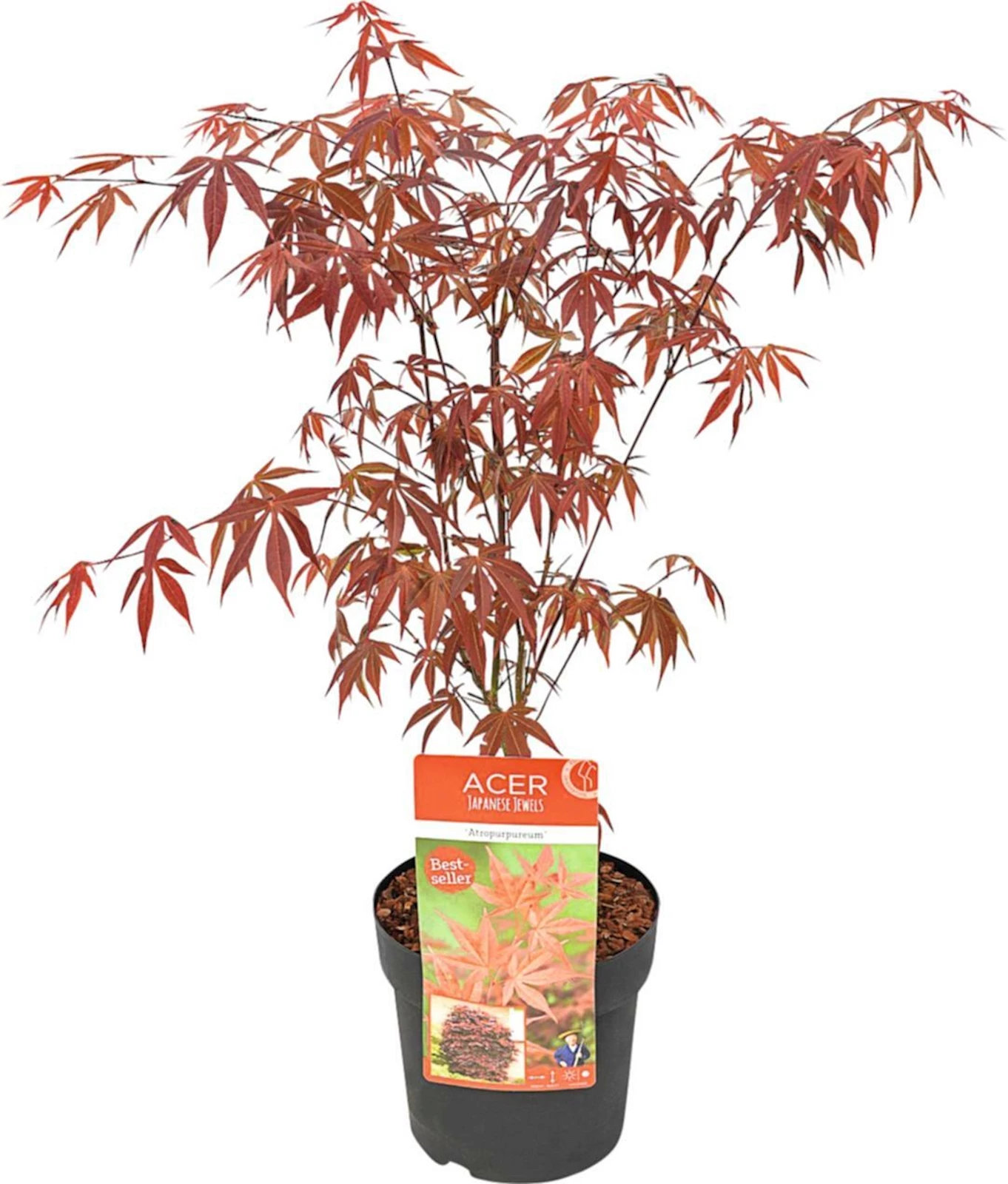 Der Acer palmatum 'Atropurpureum', auch roter japanischer Ahorn genannt, ist ein langsam wachsender Laubbaum oder Strauch, der mit seinen feinen, purpurroten Blättern das ganze Jahr über beeindruckt. Im Frühling und Sommer leuchtet das Laub in intensiven Rottönen, während es sich im Herbst in leuchtende Rot- und Orangetöne verwandelt. Mit einer Wuchshöhe von 3 bis 5 Metern ist er ideal für kleinere Gärten, als Solitärpflanze oder als schöner Akzent in Gehölzgruppen und lässt sich auch gut in Kübeln kultivieren.