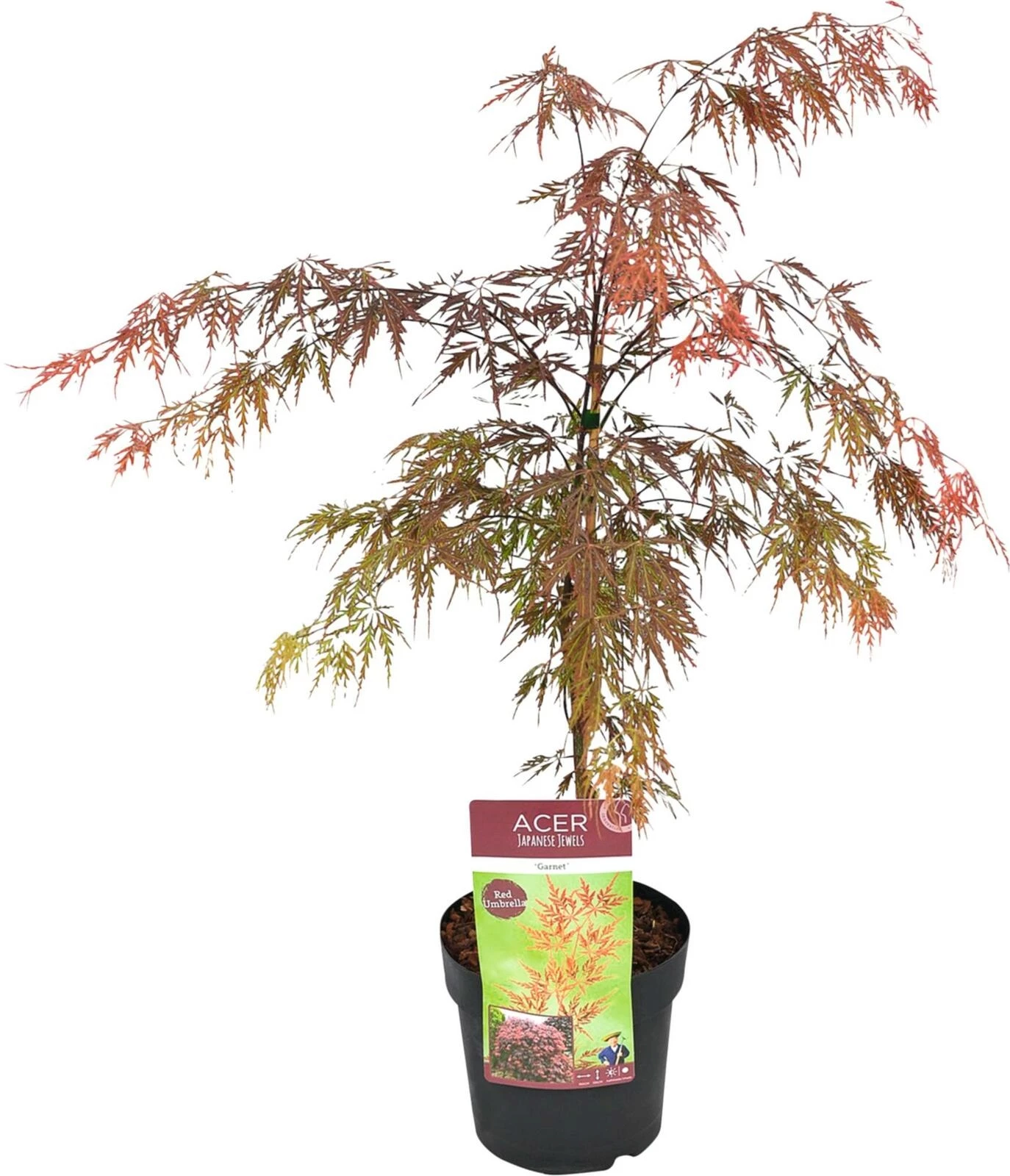 Der Acer palmatum 'Dissectum Garnet' ist ein wunderschöner, langsam wachsender japanischer Ahorn, der mit seinen feingliedrigen, fächerartig zerteilten Blättern auffällt. Im Frühling zeigt der Baum kräftige Purpurtöne, die sich im Sommer zu einem intensiven, glänzenden Burgunder entwickeln. Im Herbst färbt sich das Laub in leuchtenden Rottöne. Mit einer Wuchshöhe von etwa 1,5 bis 2,5 Metern eignet sich dieser Ahorn besonders gut für kleinere Gärten. Er kann sowohl als Solitärpflanze als auch als schöner Akzent in Gehölzgruppen eingesetzt werden und fühlt sich auch in Kübeln wohl.