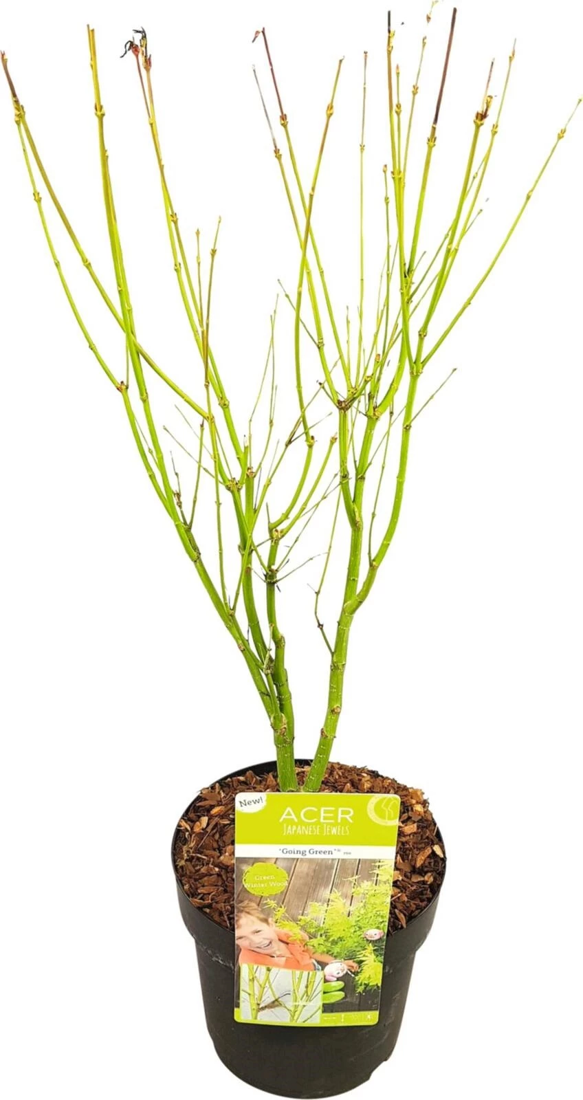 Acer palmatum 'Going Green' ist ein eleganter, mittelgrosser japanischer Ahorn mit einem aufrechten, leicht ausladenden Wuchs. Seine frischgrünen Blätter treiben im Frühling leuchtend aus, bleiben den Sommer über grün und färben sich im Herbst in warme Gelb- bis Orangetöne. Der Ahorn ist ideal für kleine Gärten oder Kübel, da er wenig Platz braucht und langsam wächst.