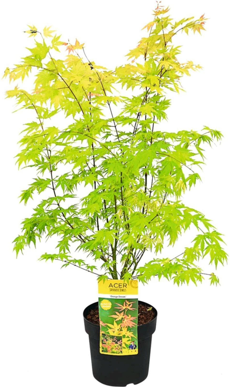Der Acer palmatum 'Orange Dream' ist ein hübscher, langsam wachsender japanischer Ahorn mit feinen, zarten Blättern. Im Frühling leuchten die Blätter in Gelborange, im Sommer werden sie grün, und im Herbst färben sie sich kräftig orange und rot. Mit einer Höhe von 2 bis 3 Metern passt der Ahorn gut in kleine Gärten. Er kann einzeln stehen, in Gruppen gepflanzt oder in Kübeln gehalten werden.
