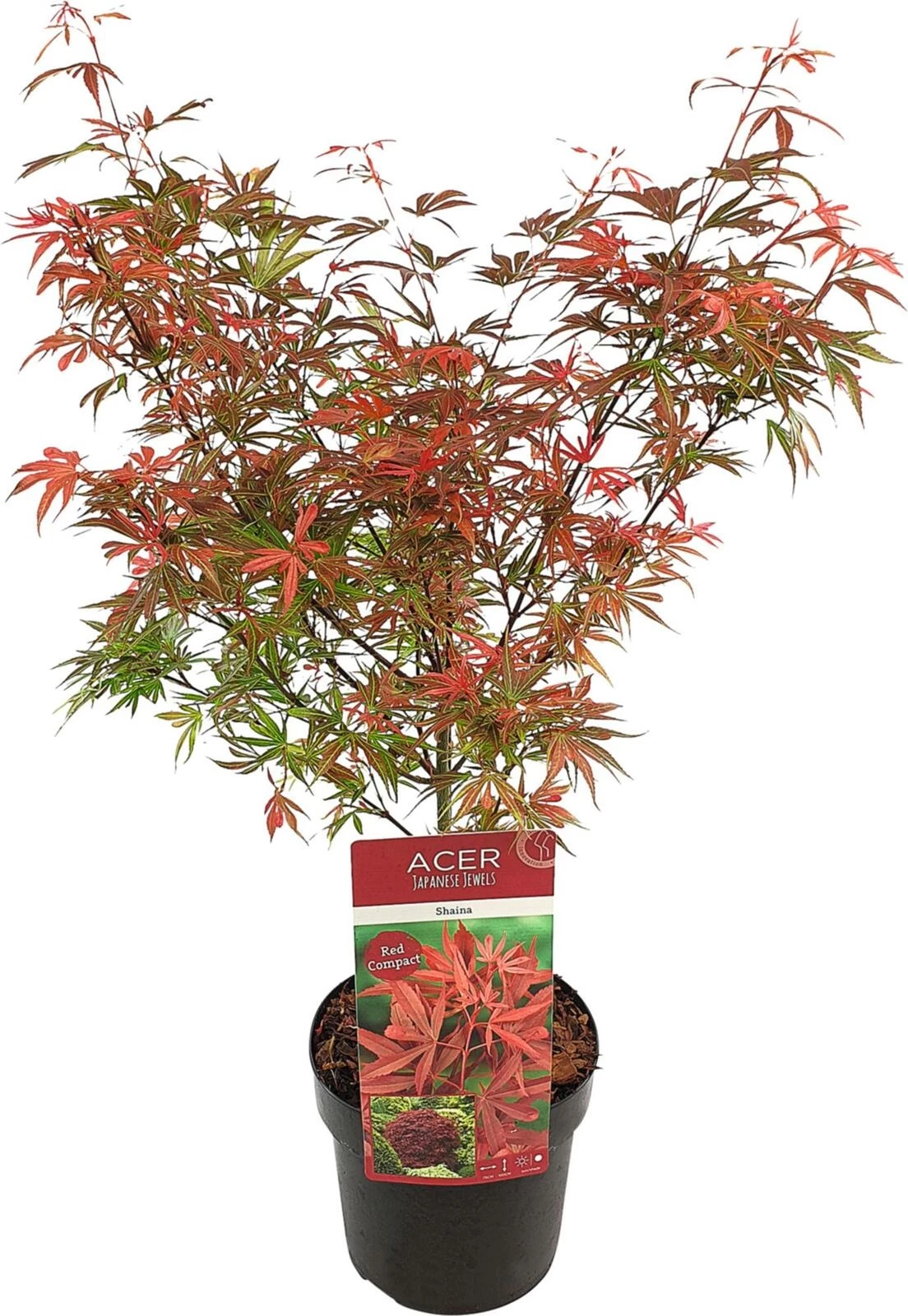 Der Acer palmatum 'Shaina' ist ein kleiner, langsam wachsender japanischer Ahorn. Er bleibt kompakt und wird nur etwa 1,5 bis 2 Meter hoch. Im Frühling sind die Blätter grün, im Sommer färben sie sich purpurrot, und im Herbst leuchten sie in kräftigem Rot. Der Ahorn ist ideal für kleine Gärten oder Kübel, da er wenig Platz braucht und langsam wächst.