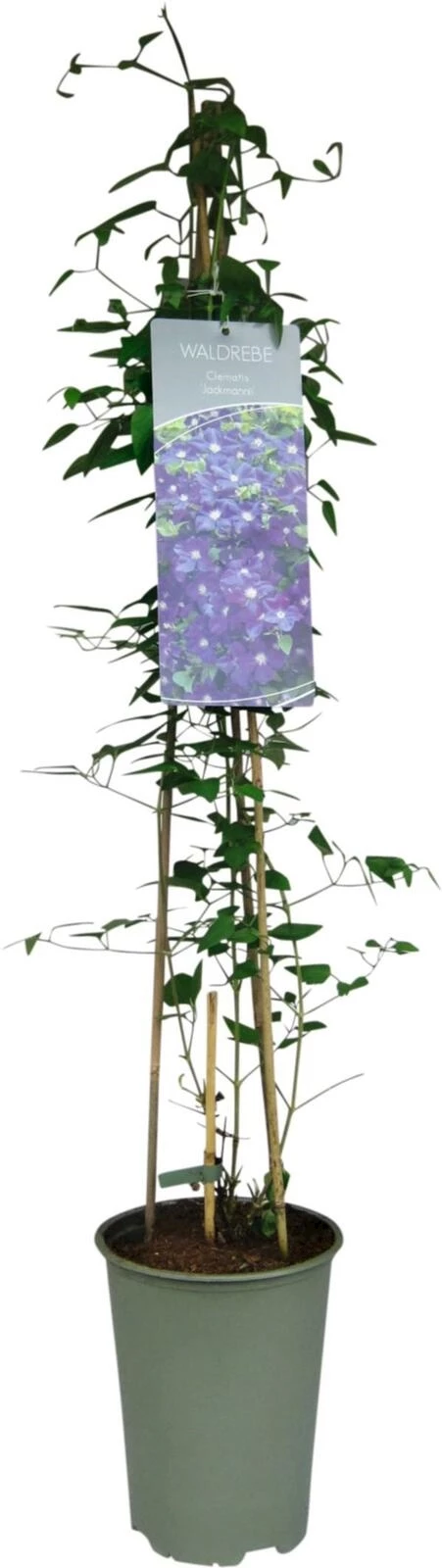 Clematis 'Jackmanii' ist eine robuste, schnell wachsende Kletterpflanze, die besonders durch ihre schönen, tiefvioletten Blüten auffällt. Die Blüten sind gross und erscheinen von Juni bis September. Diese Clematis eignet sich hervorragend für Spaliere, Zäune, Pergolen oder Wände, da sie eine beeindruckende Kletterpflanze bildet. Ihr kräftiger Wuchs macht sie zu einer beliebten Wahl für Gärten, in denen sie als auffällige Begrünung eingesetzt wird.
