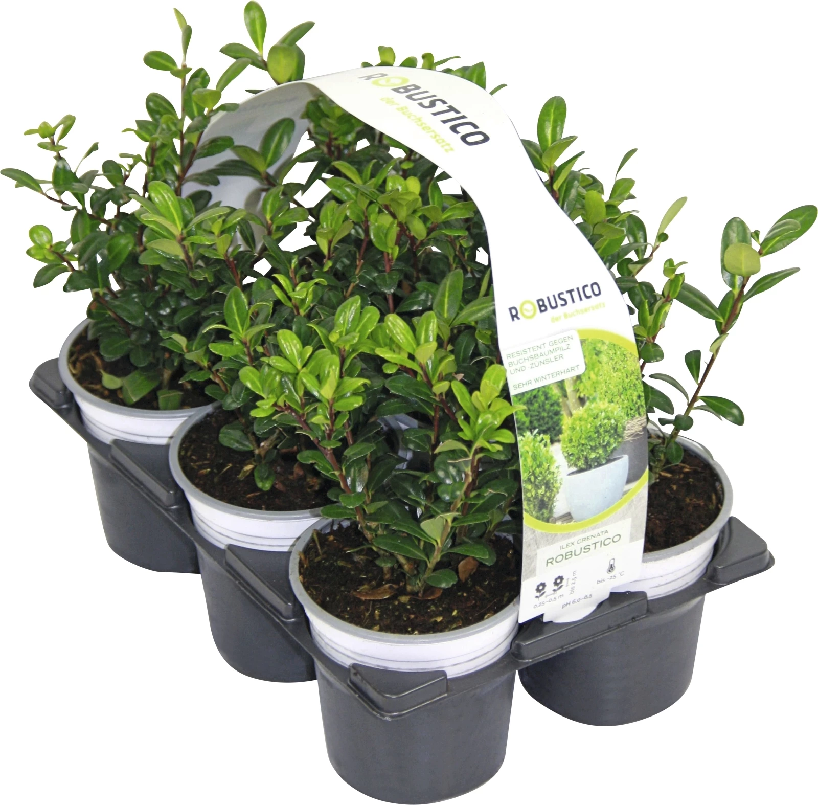Ilex Robustico ist eine immergrüne, mehrjährige Stechpalme, welche sich als Heckenpflanze gut eignet. Sie gehört ursprünglich zu der Familie der japanischen Stechpalmen, wird jedoch als besseren Buchsbaum bezeichnet. Dieser Ilex ist sehr schattenverträglich, frosthart und vor allem resistent gegen die weitläufig aggressiven Buchskrankheiten. Er blüht weiss zwischen Mai und Juni. Beim Kauf ist der Ilex ca. 50 - 60 cm gross und erreicht eine maximale Wuchshöhe von ca. 1,5 – 1,8 m. Der Ilex Robustico mag mässig feuchten, sandigen, humusreichen und lehmigen Boden. Er gilt als gefeierter Buchsersatz, da er die optischen Qualitäten des Buchsbaums mit robuster Gesundheit vereint.