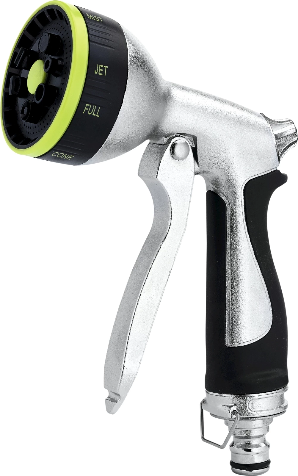 Bietet eine Auswahl von 6 verschiedenen Strahlarten und ist für die Verwendung mit Messing- oder Kunststoffstecksystemen geeignet. Die Brause besteht aus Metall und hat einen gummierten Griff.