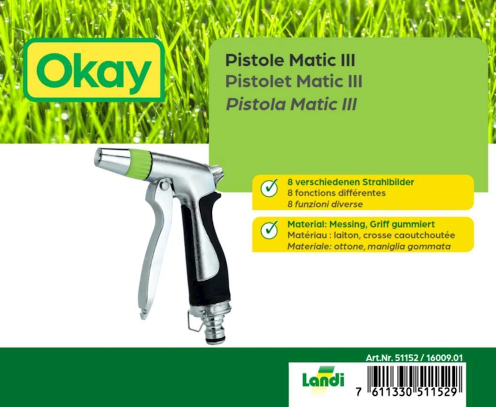 Die Pistole Matic Okay III wird aus Metall hergestellt und hat einen gummierten Griff, um Ihnen eine sichere Handhabung zu bieten. Sie können die Brause auf 8 unterschiedliche Strahlbilder einstellen, so haben Sie für jede Situation das passende Strahlbild.