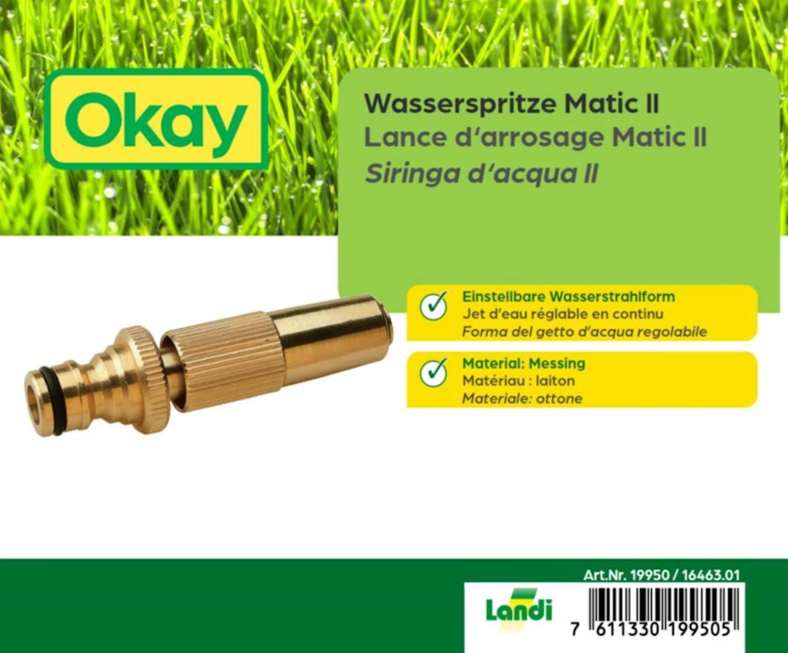Die Wasserspritze Matic II verfügt über eine stufenlos einstellbare Wasserstrahlform. Die Wasserspritze wird aus Messing hergestellt.