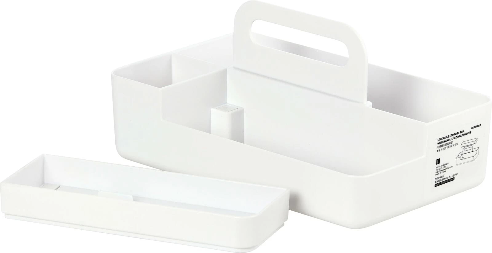 Unterteilte Fächer für Büromaterial. Stapelbar und dank Griff flexibel transportierbar. Material: Kunststoff. Masse: 26 × 16 × 11,5 cm.