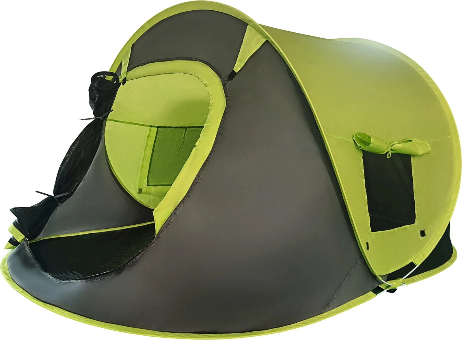 Dieses leichte Wurfzelt ist ideal für zwei Personen und ist innert kürzester Zeit aufgebaut, perfekt zum Reisen geeignet. Das Aussenzelt besteht aus 190T Polyester mit einer PA-Beschichtung, der Boden ist aus 110 g Polyethylen hergestellt. Die leichten Zeltstangen sind aus Fiberglas und haben einen Durchmesser von 5 mm. Zudem verfügt das Zelt über zwei kleine Fenster an den Seiten. Diese können geschlossen werden für die Nacht und geöffnet werden, für eine optimale Durchlüftung. Zum Schutz vor Mücken oder anderen Insekten ist beim Eingang ein Insektennetz angebracht, welches mit einem Reissverschluss geöffnet oder geschlossen werden kann. Im Lieferumfang ist das Befestigungsmaterial von 8 Seile und 4 Heringe inbegriffen. Das Wurfzelt hat eine Grösse von 220 × 120 × 95 cm und hat die Farben grün und schwarz.