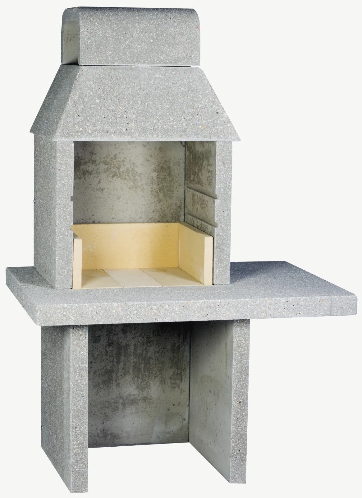 Material: Waschbeton aus grauem Kieselstein. Mit Elementhut. Mit Rillen für Rost und Hülse für Schwenkarm. Voll schamottiert. Unmontiert.