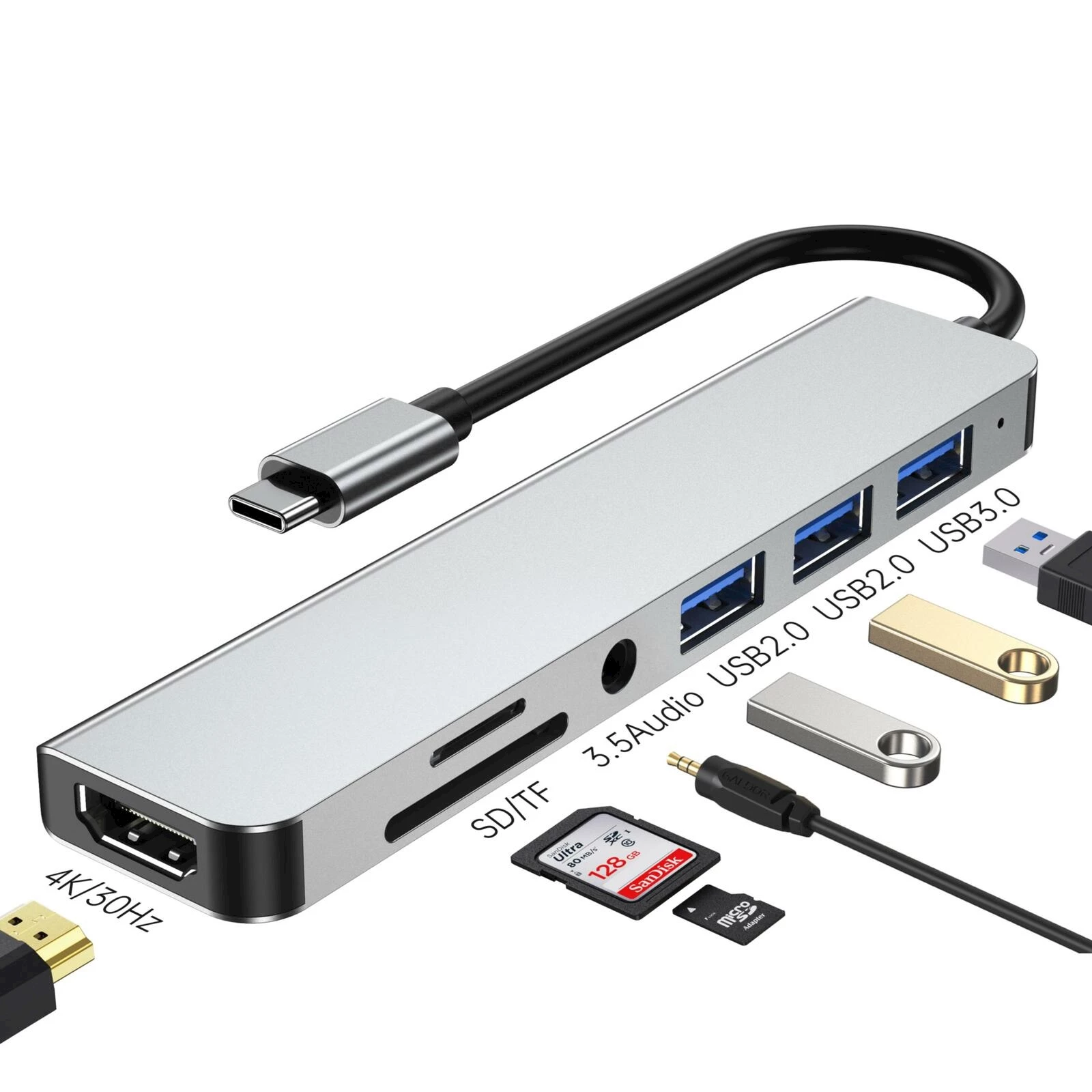 Der Multi Port 7-in-1 verwandelt Ihren Laptop, PC oder Ihr Android-Gerät in eine vielseitige Multimedia-Schnittstelle. Ausgestattet mit USB-C-Anschluss und sieben praktischen Ports bietet der Adapter alles, was Sie im Alltag brauchen: USB 3.0- und 2.0-Anschlüsse für schnelle Datenübertragungen, SD- und MicroSD-Kartenleser für Fotos und Dateien, HDTV-Ausgang für brillante Bildwiedergabe sowie AUX-Anschluss für Audioverbindungen.