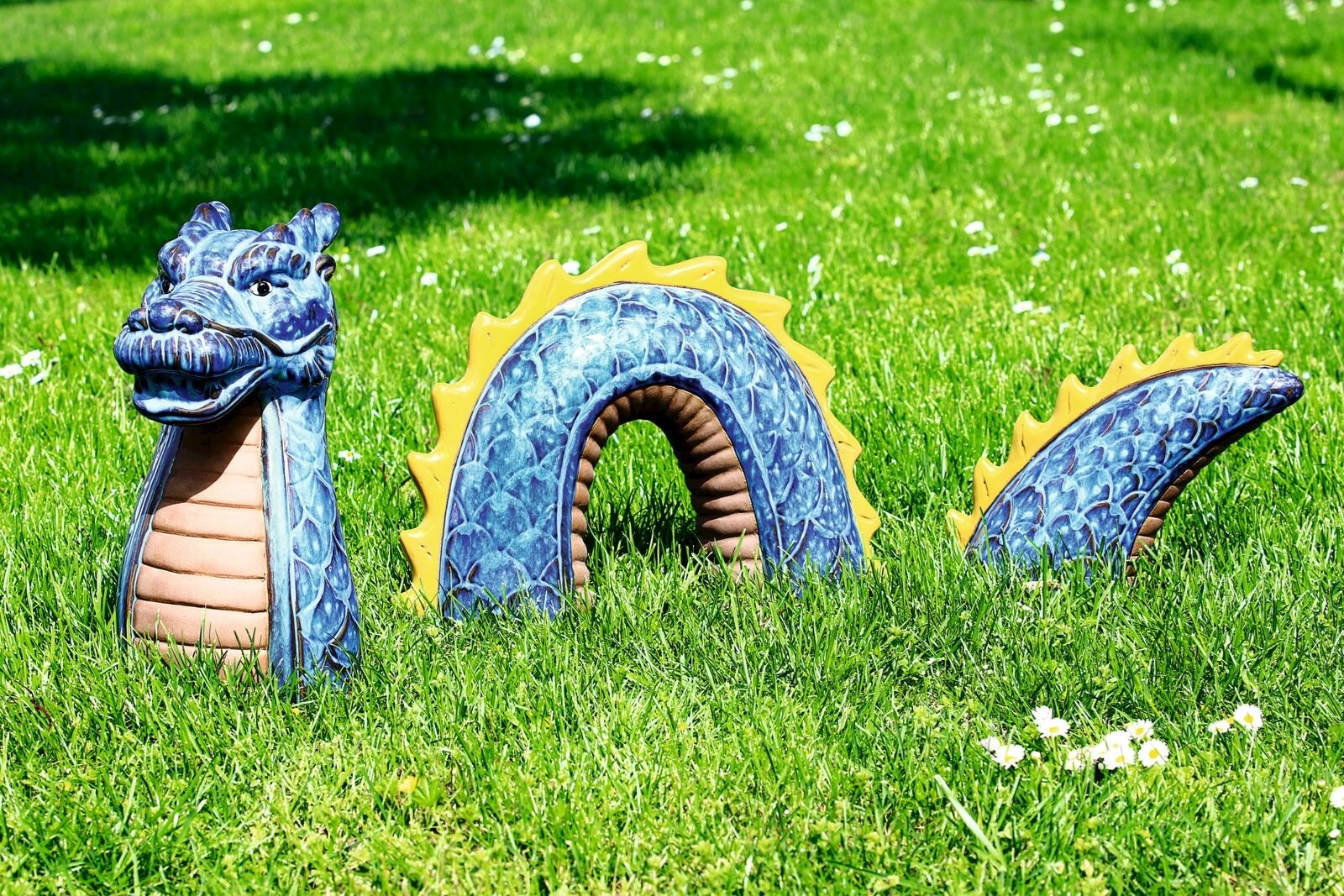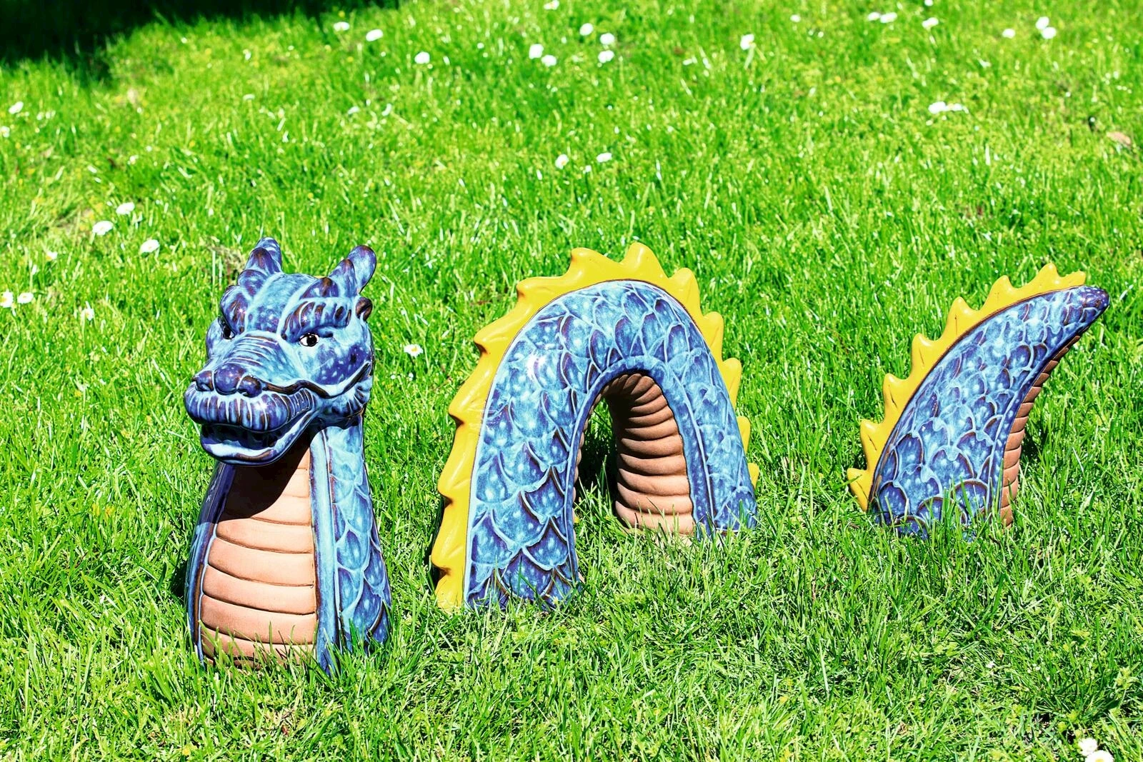 Dekorativer 3-teiliger Drachen für den Garten. Aus Terracotta mit einer Glasierung. In grün und blau erhältlich. Gewicht: Ca. 13 kg.