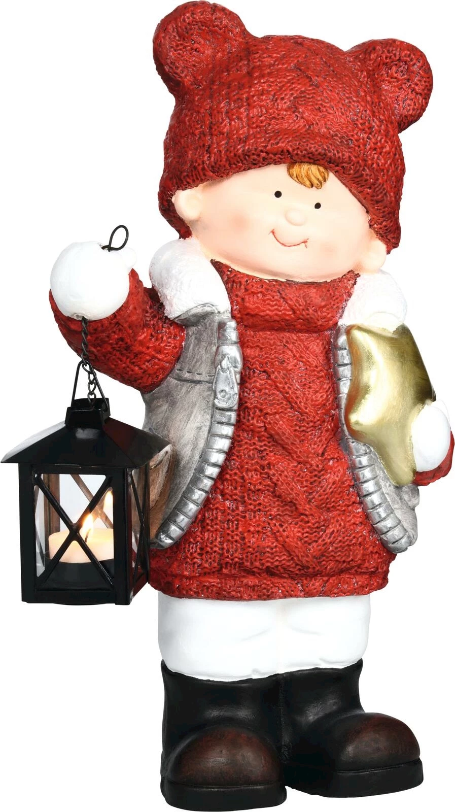 Diese entzückende Dekofigur aus Magnesia strahlt pure Weihnachtsfreude aus und bringt festliche Stimmung in Ihr Zuhause. Der niedliche Junge trägt eine rote Strickmütze mit lustigen Ohren, eine kuschelige rote Jacke mit silbernen Akzenten und weissem Fellbesatz, sowie eine weisse Hose und robuste Stiefel. In der einen Hand hält er einen goldenen Stern, in der anderen eine klassische schwarze Laterne, in die sich eine Kerze platzieren lässt. Masse: 23,2 × 26,7 × 39,5 cm. Gewicht: 1,8 kg.