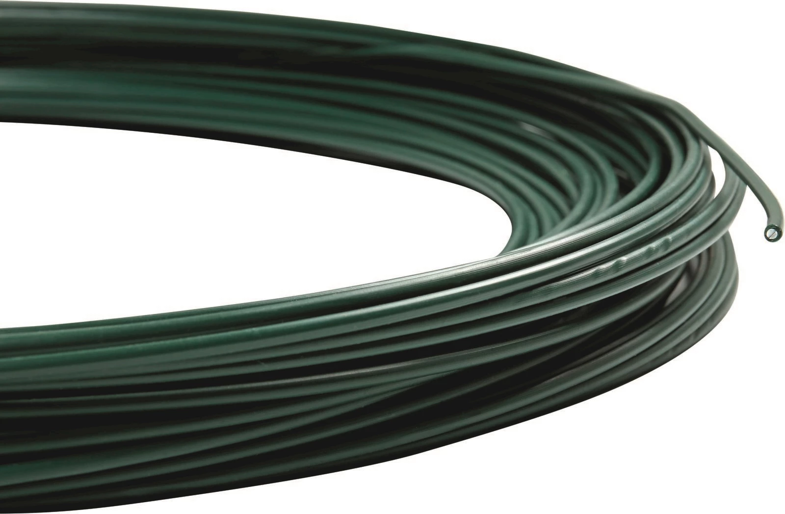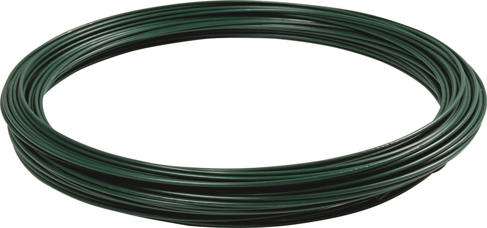 PVC beschichtet. Zaun-, Bastel- und Befestigungsdraht. Drahtstärke: Ø 2,0 mm. Durchmesser mit Ummantelung: Ø 3,5 mm. Länge: 50 m. Farbe: Grün.