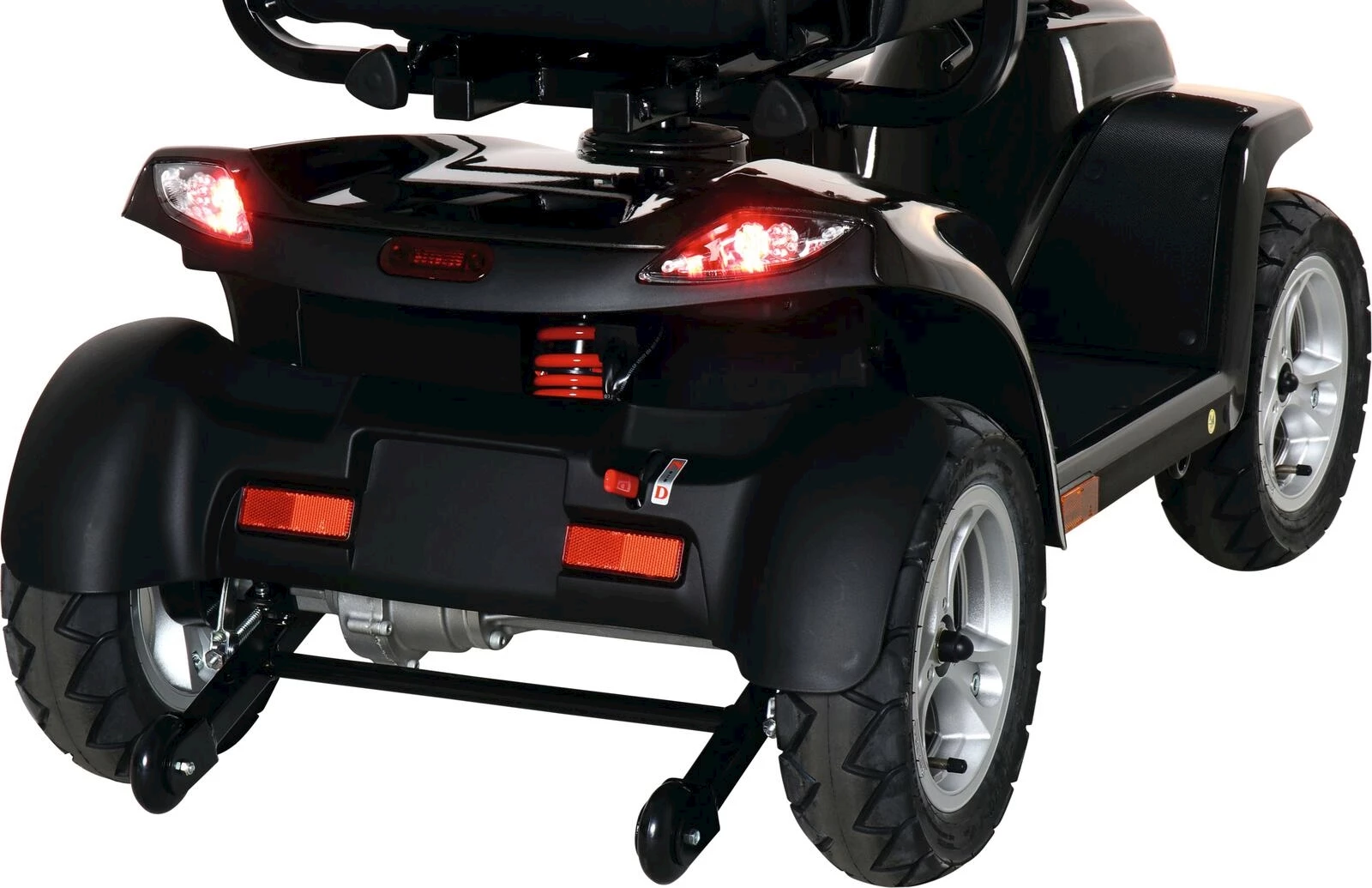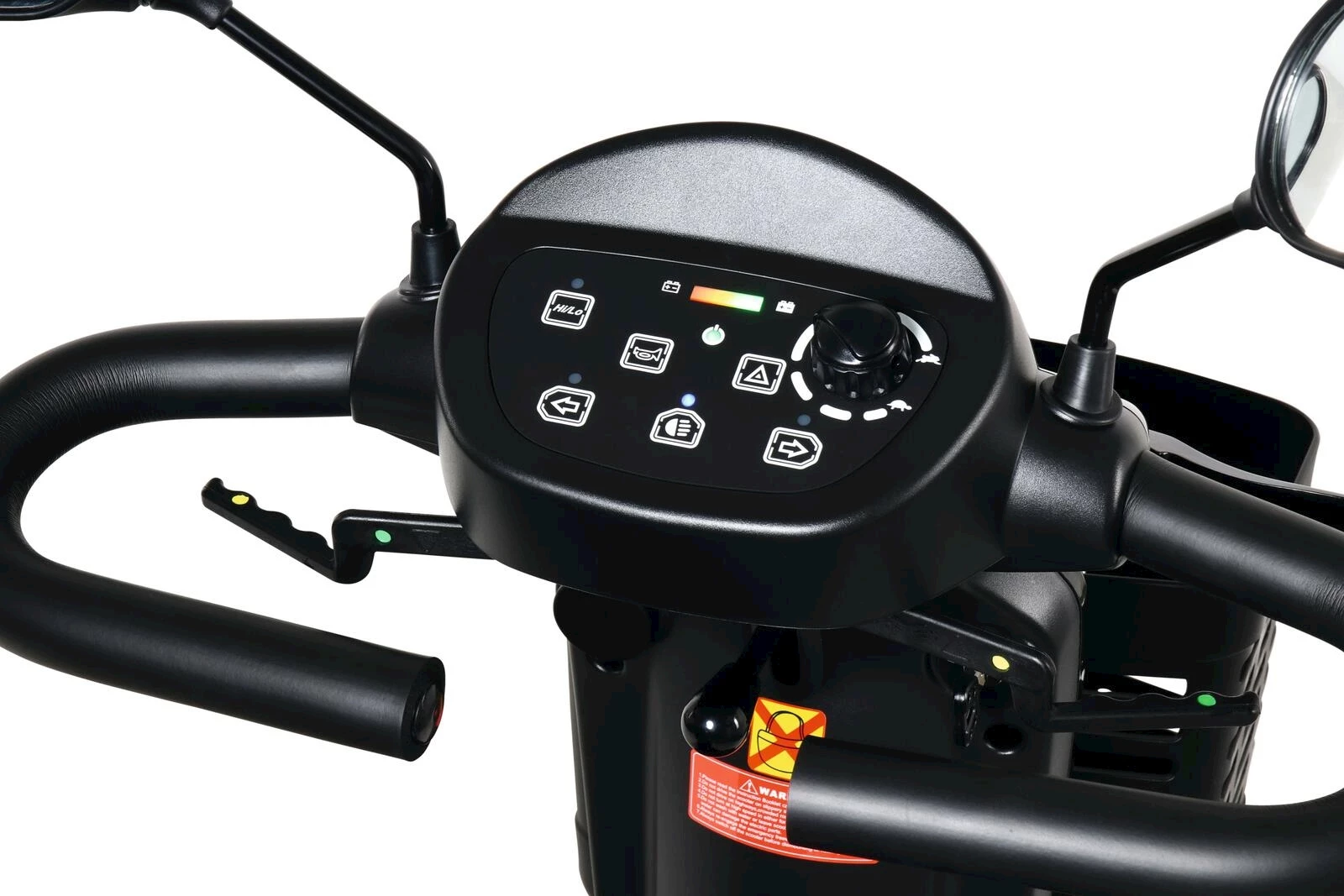 Hi-Low Schalter, Drehregler zur stufenlosen Geschwindigkeitsregelung, Vorwärts- und Rückwärtsgang via Wippe bedienbar, Blinker, Licht, Warnblinkanlage, automatisches Bremslicht, Batteriestandanzeige (Ladezustand), 3-Speichen Aluräder, Frontkorb, elektromechanisches Bremssystem mit zusätzlicher Handbremse, drehbarer Komfort-Sitz justierbar und inkl. Nackenstütze, klappbare Armlehnen, Rückspiegel links und rechts, Anti-Kipp Räder hinten, manuelle Getriebeentriegelung, in der Neigung justierbare Lenkstange, umlaufende D-Lenkstange gepolstert, voll gefedertes Fahrwerk, Zündschloss mit zwei Zündschlüsseln, externes Batterieladegerät. Eine vollständige Akkuladung benötigt ca. 8 Stunden.