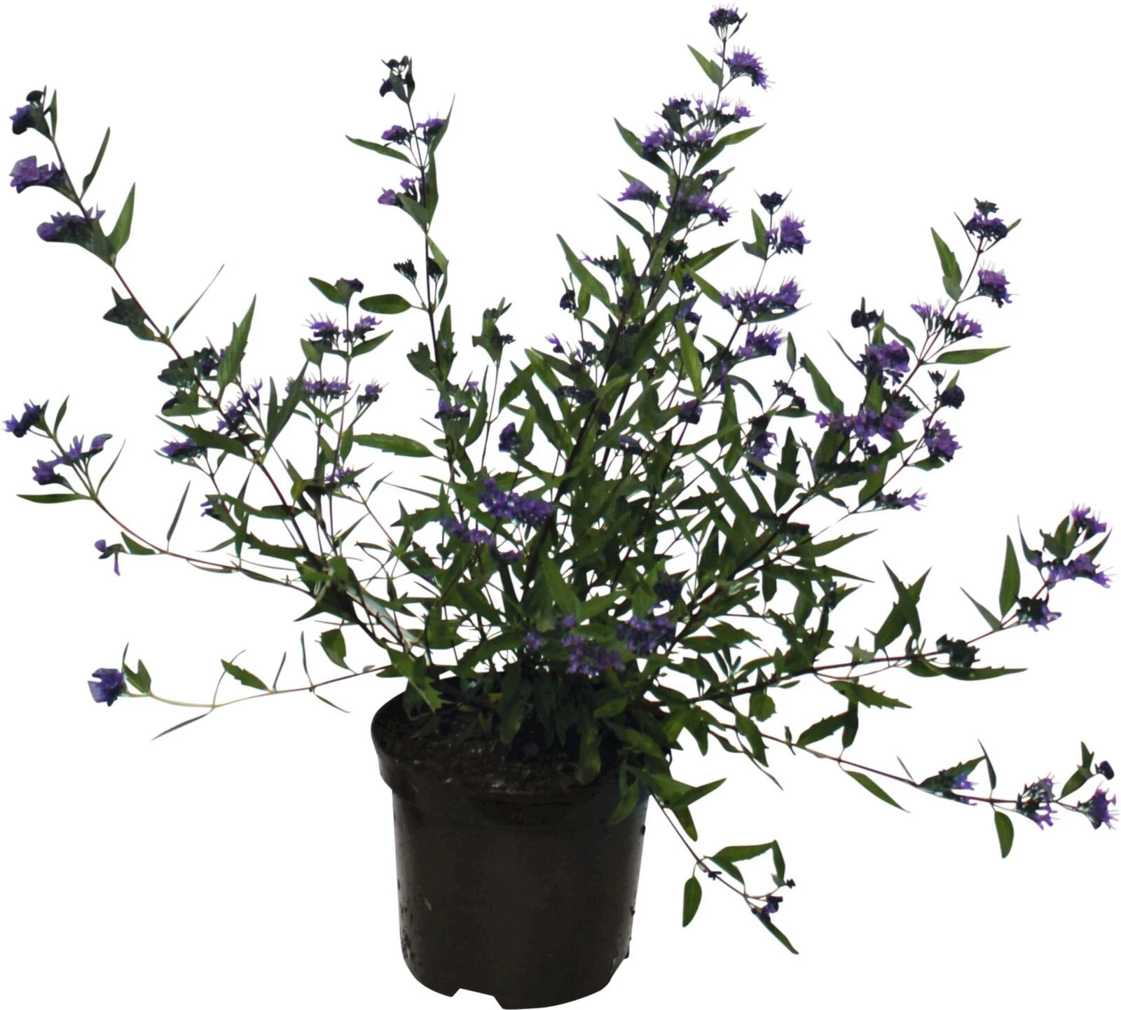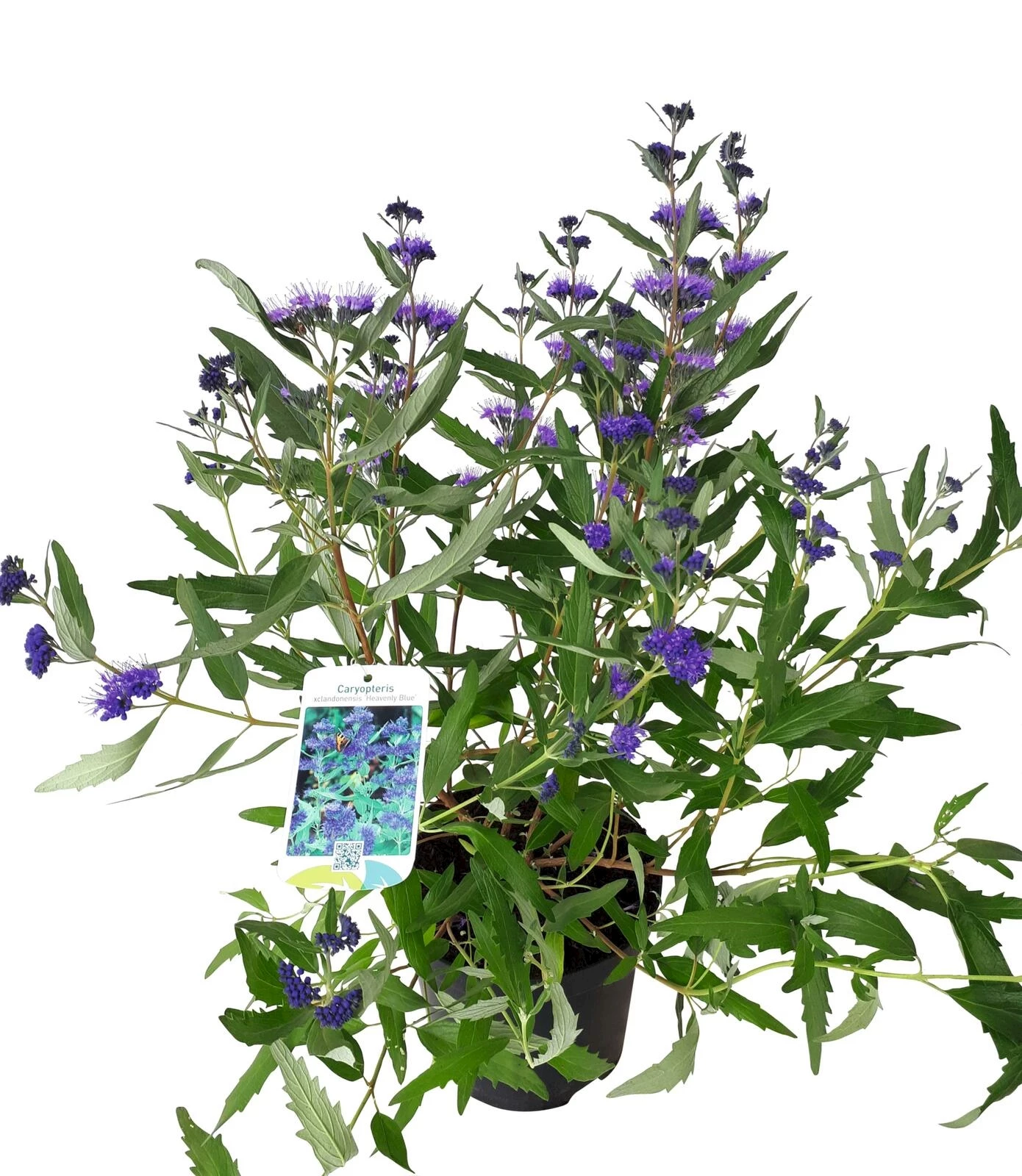 Caryopteris clandonensis 'Heavenly Blue' ist eine Sorte von Caryopteris, einer blühenden Pflanze, die auch als blaue Bartblume bekannt ist. Sie zeichnet sich durch ihre auffälligen blauen Blüten aus und ist eine beliebte Wahl für Gärten und Landschaften. Die 'Heavenly Blue'-Sorte bildet kompakte Sträucher mit einer Wuchshöhe von etwa 60 bis 90 Zentimetern. Die gegenständig angeordneten, lanzettlichen Blätter sind silbergrau und verleihen der Pflanze eine attraktive Laubfarbe. Im Spätsommer bis Herbst produziert sie zahlreiche kleine, trichterförmige Blüten in einem leuchtenden Himmelblau, die Schmetterlinge und Bienen anziehen. Caryopteris clandonensis 'Heavenly Blue' bevorzugt einen sonnigen Standort und durchlässigen Boden. Sie ist eine trockenheitstolerante Pflanze und eignet sich daher gut für Gärten mit geringer Bewässerung. Diese Bartblume eignet sich hervorragend als Rabattenpflanze, in Steingärten oder als Teil von gemischten Staudenbeeten. Sie kann auch als blühende Hecke oder in Kübeln und Behältern angebaut werden.