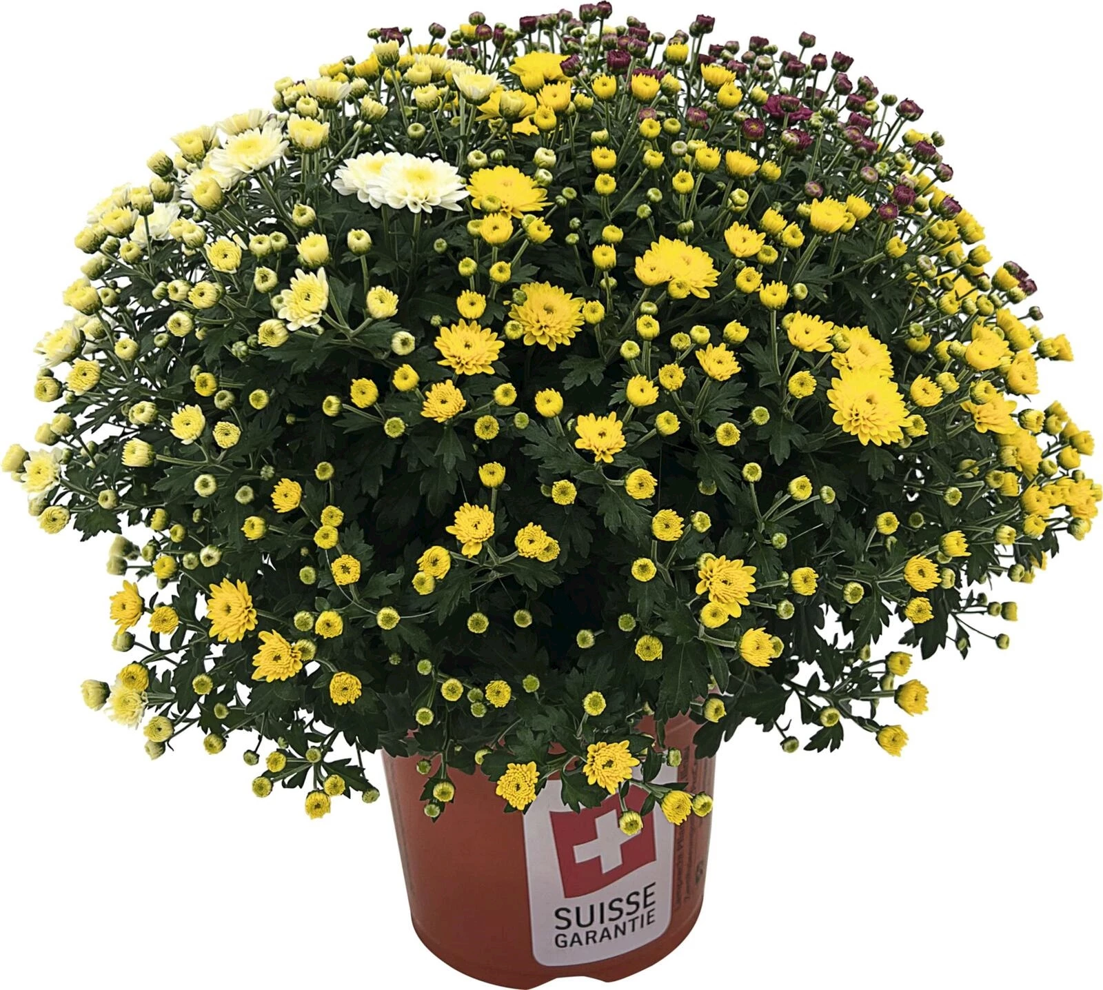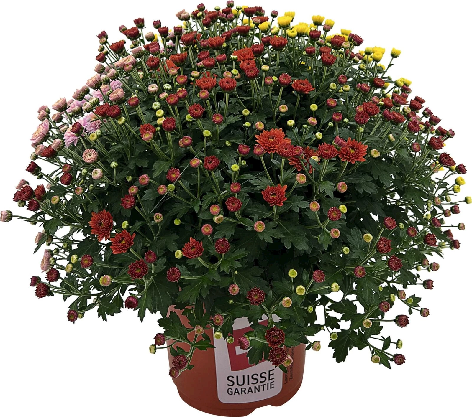 Die Chrysantheme (Chrysanthemum Indicum-Hybriden) ist eine einjährige Pflanze, welche in verschiedenen Farben erhältlich ist. Sie blüht zwischen August und November. Die enorm lange Blütezeit über mehrere Wochen, vor allem die der gefüllten Formen, reicht bis zum Frost. Der Boden sollte mässig feucht, nährstoffreich und durchlässig sein.