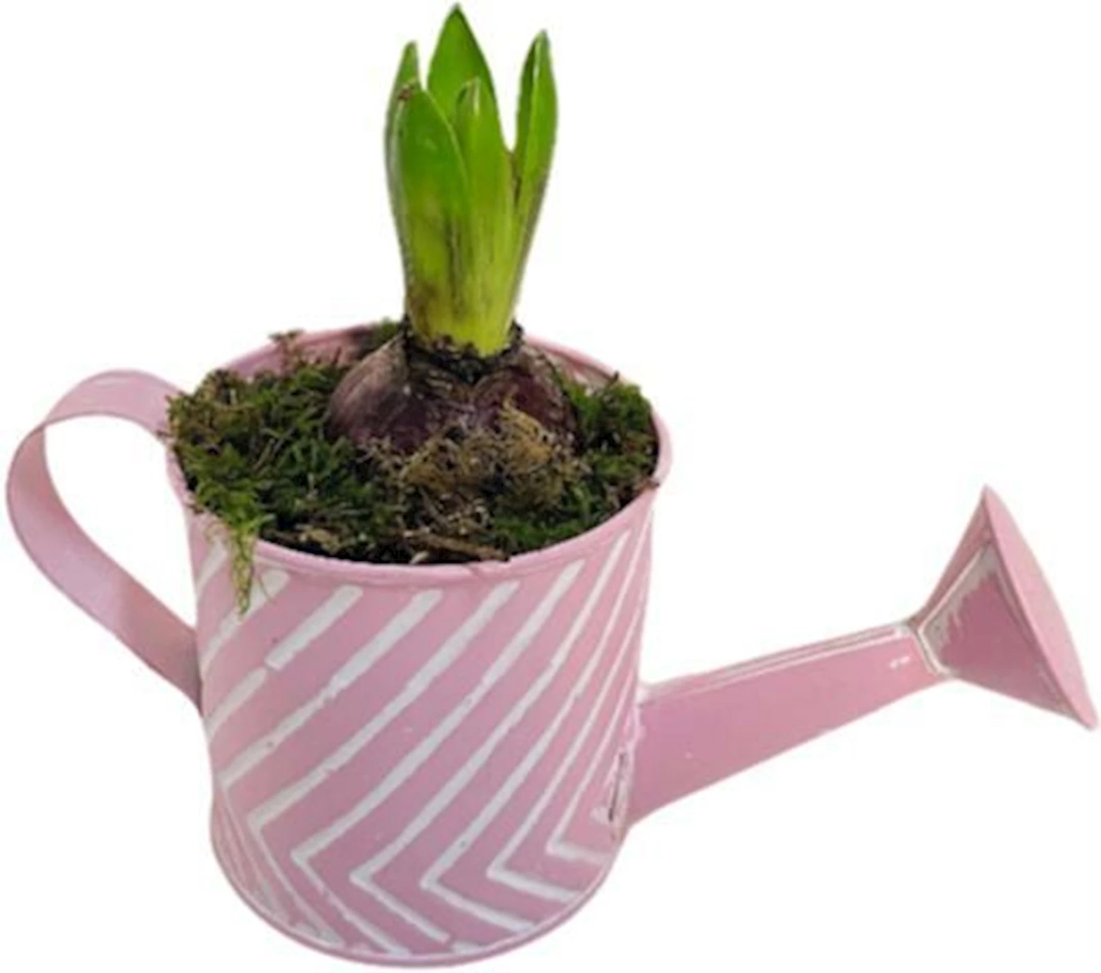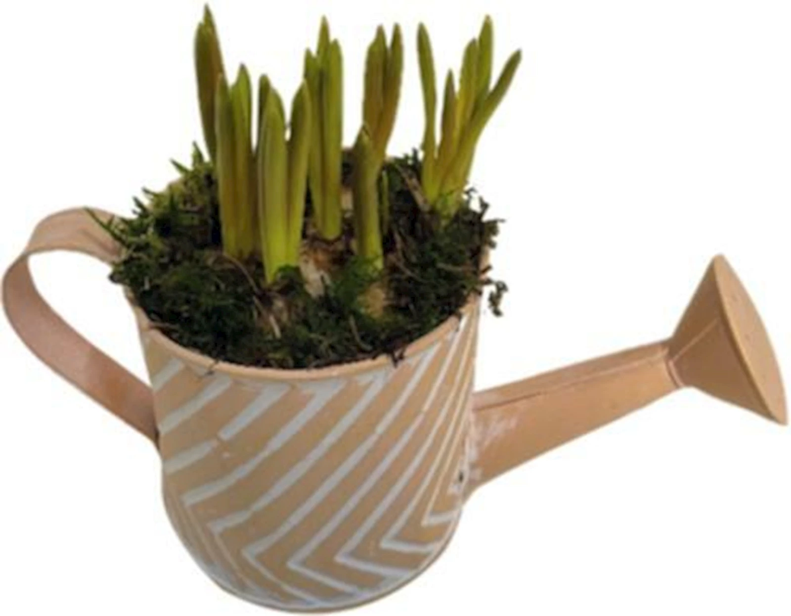 Frühlingszwiebeln gepflanzt in eine Zinkgiesskanne. Das pflegeleichtes Arrangement welches mit farbenfrohen Frühlingsblühern bepflanzt ist und zwischen Januar und Mai blüht. Er bevorzugt einen sonnigen bis halbschattigen Standort mit einem mässig feuchten Boden. Giessen sie das Arrangement regelmässig und achten Sie darauf, dass sich keine Staunässe bildet. Die leicht duftenden Blüten bilden viel Nektar und gilt somit als eine wichtige Nahrungsquelle für Bienen, Schmetterlinge und andere Insekten. Die Blüten sind speziell um diese Jahreszeit, beliebt bei Insekten.