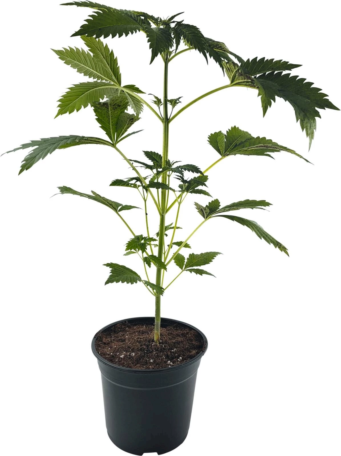 Zu Beginn sollte die Pflanze in einen Topf mit 6 bis 8 Litern umgetopft werden. Nach etwa einem Monat empfiehlt es sich, die Pflanze in einen grösseren 20-Liter-Topf zu setzen, um das Wachstum zu fördern. Für den Anbau im Freien ist ein sonniger Standort mit 6 bis 8 Stunden direkter Sonneneinstrahlung pro Tag ideal. Dies kann ein Balkon, eine Terrasse oder ein Fensterbrett sein. Die Temperaturen sollten zwischen 12 °C und 30 °C liegen. Die Pflanze muss vor starkem Wind und Regen geschützt werden, damit sie nicht umknickt. Hanf benötigt regelmässige, aber nicht zu starke Bewässerung. Es ist wichtig, Staunässe zu vermeiden, um Wurzelfäule vorzubeugen. Regelmässiges Düngen fördert das gesunde Wachstum der Pflanze. Es wird empfohlen, bei jedem zweiten Giessen speziellen Hanfdünger oder Wachstumsdünger zu verwenden. Sobald die Blüten etwa 3 cm gross sind, sollte auf Blütendünger gewechselt werden.