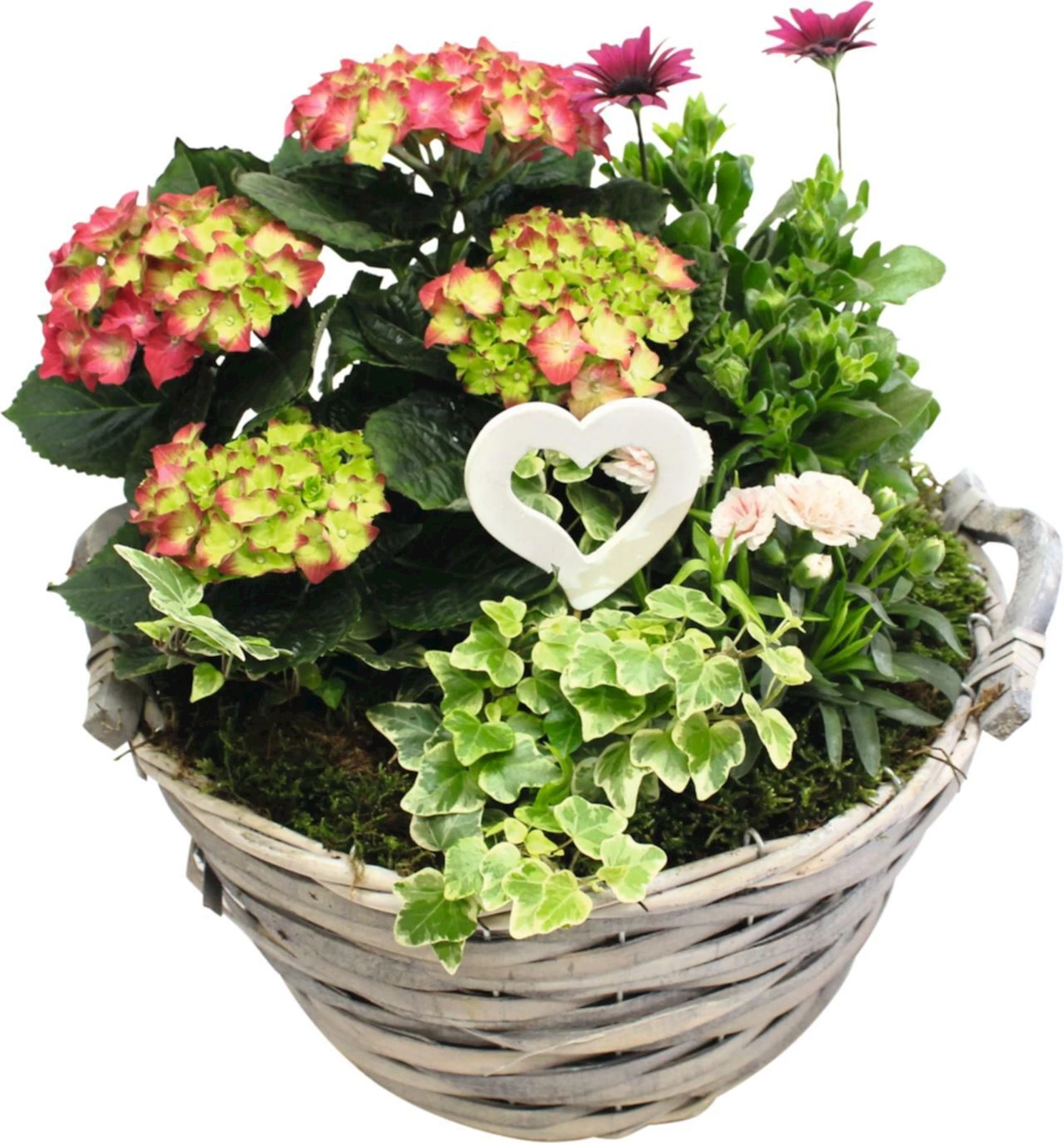 Der Henkelkorb ist bepflanzt mit Hortensie (Hydrangea), Kapkörbchen (Osteospermum), Nelken (Dianthus) und Efeu (Hedera helix). Die Blütezeit ist zwischen Mai und September in verschiedenen Farben. Die Pflanzen sind alle zweijährig oder mehrjährig. Optimal stellen Sie den Korb an einen halbschattigen Standort.