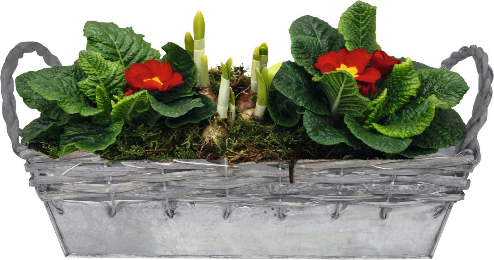 Pflegeleichtes frühlings Arrangement in Korb mit einer langen Blühzeit.