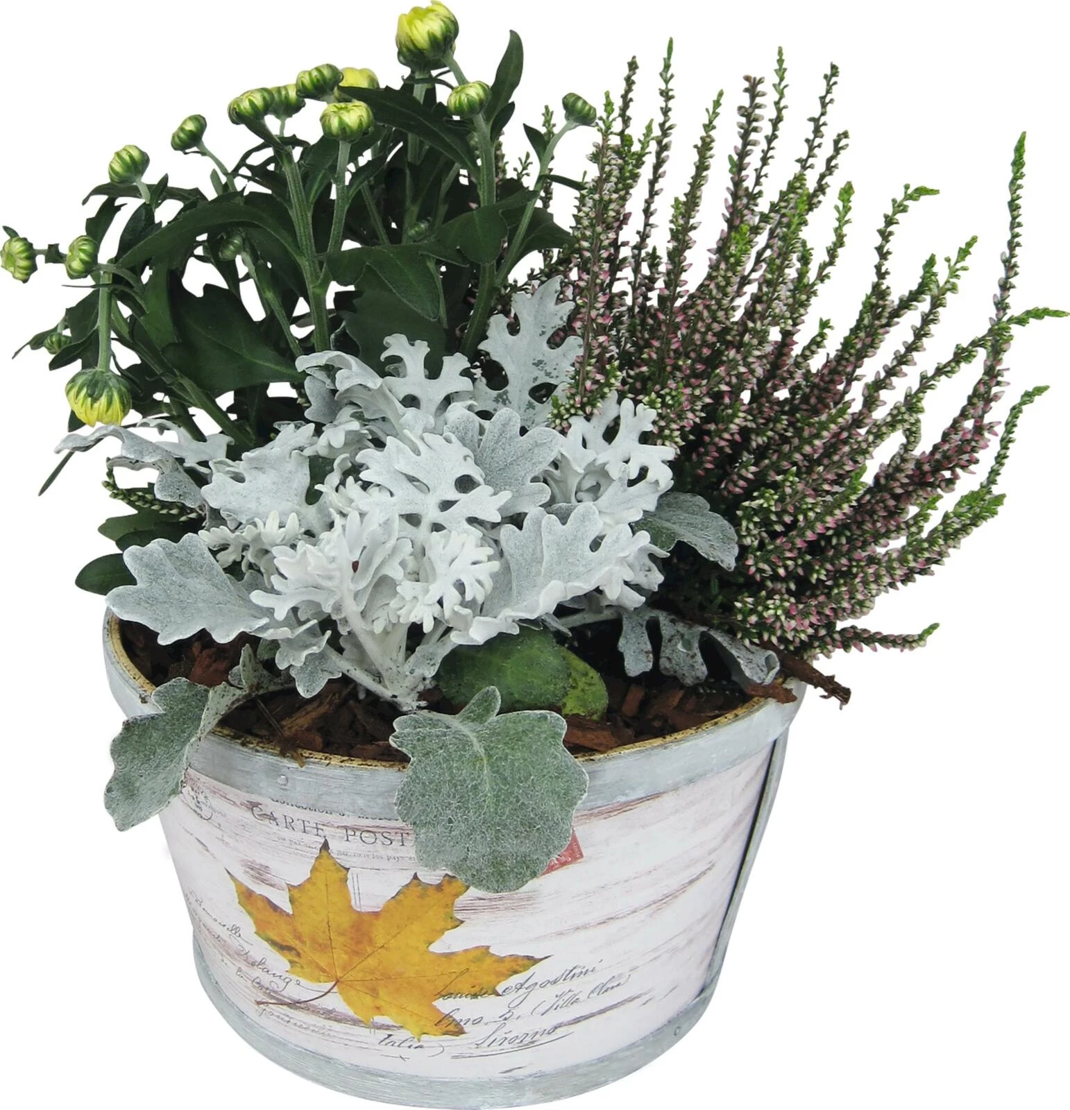 Herbstlich bepflanzter Holztopf mit Chrysanthemen, Calluna und Senecio.