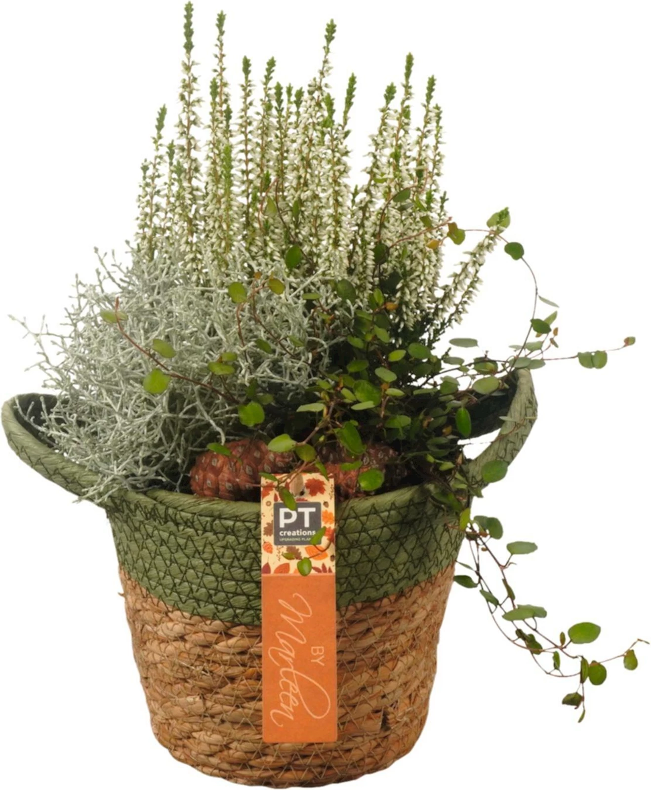 Ländlicher Charme im runden Schilfkorb mit Calluna, Heuchera und Mühlenbeckia.