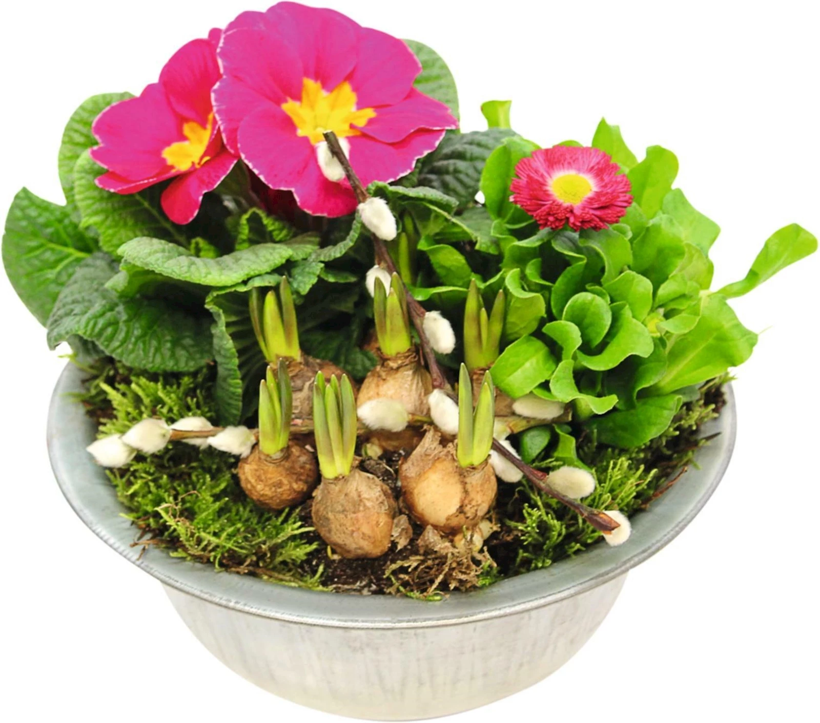 Pflegeleichtes frühlings Arrangement in Zinkschale mit einer langen Blühzeit.