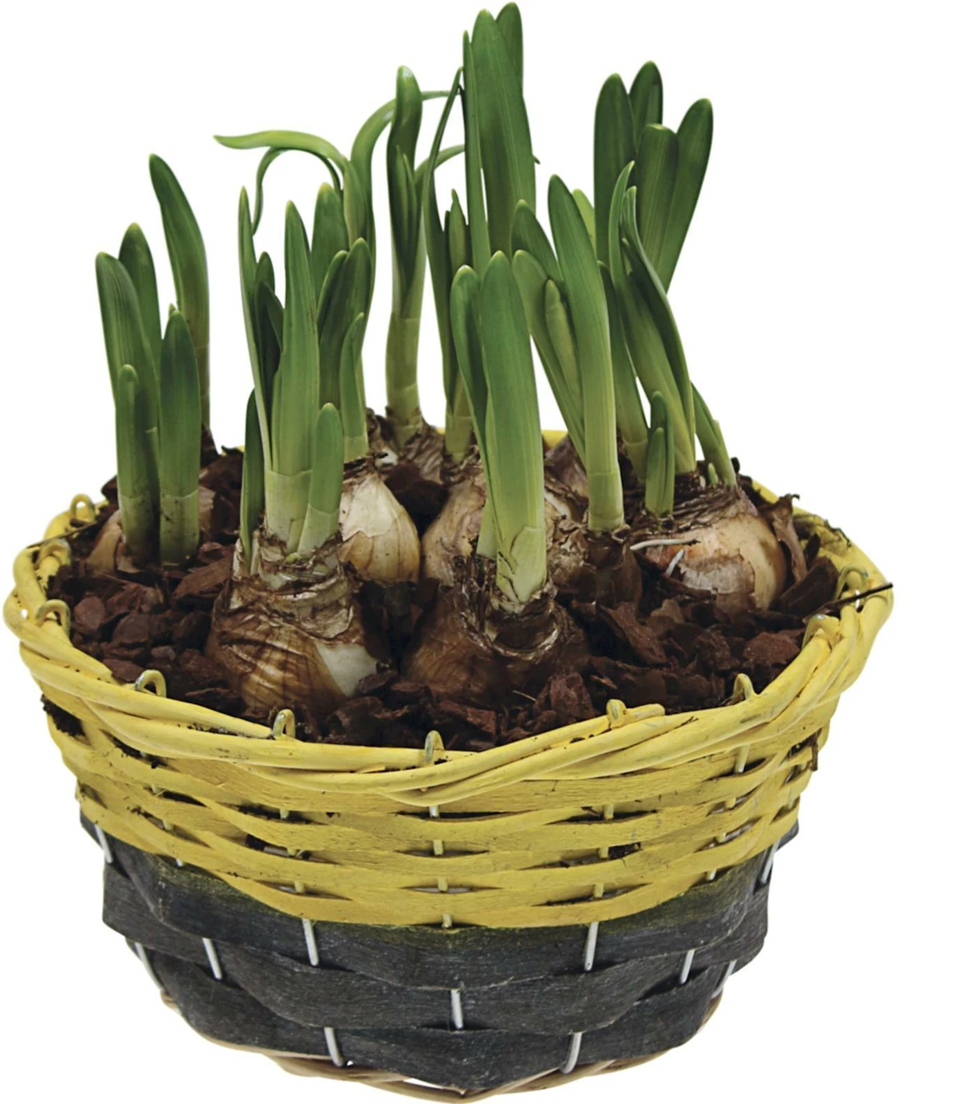 Der Korb ist mit Zwiebeln bepflanzt. Die schönen Frühlingsblüher blühen in den verschiedenen Farben zwischen März und Mai.