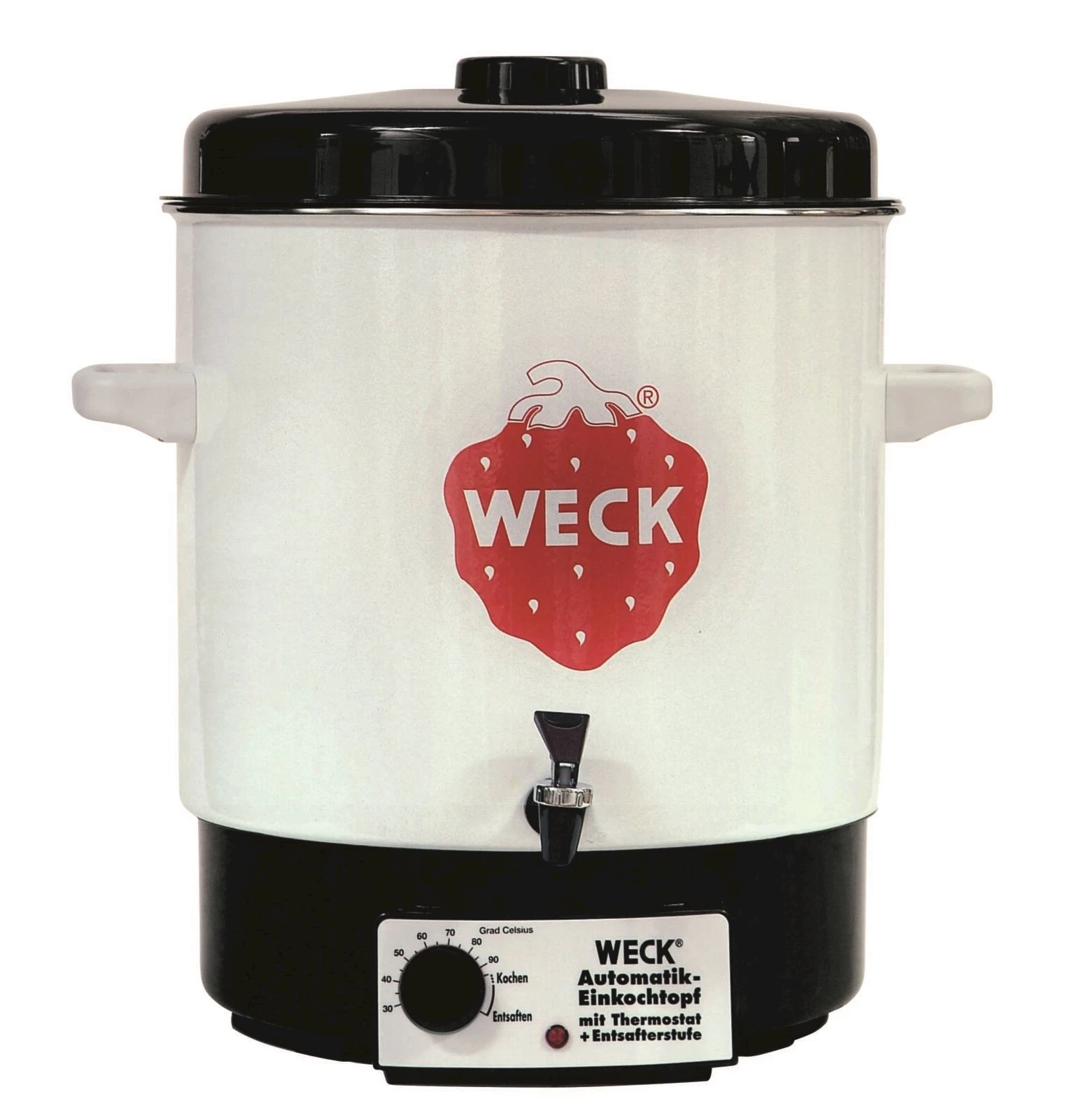 Der Einkochautomat von Weck hat einen geschlossenen Topfboden ist geeignet zum Einkochen und Warmhalten von verschiedenen Flüssigkeiten wie Suppen, Kaffee, Glühwein etc. einfache Entnahme über den frontseitig angebrachten Hahn. Der Einkochautomat mit Thermostat und Entsafterstufe ist mit den 2000 Watt ein leistungsstarkes Modell. Er bietet Platz für 29 Liter Inhalt. Der Topfdurchmesser beträgt 35,3 cm. Die 2-Schicht-Emaillierung hat eine hohe Beständigkeit inkl. einem Einlegerost und Deckel. Ein Überhitzungsschutz ist eingebaut. Die Garantiedauer beträgt 5 Jahre.