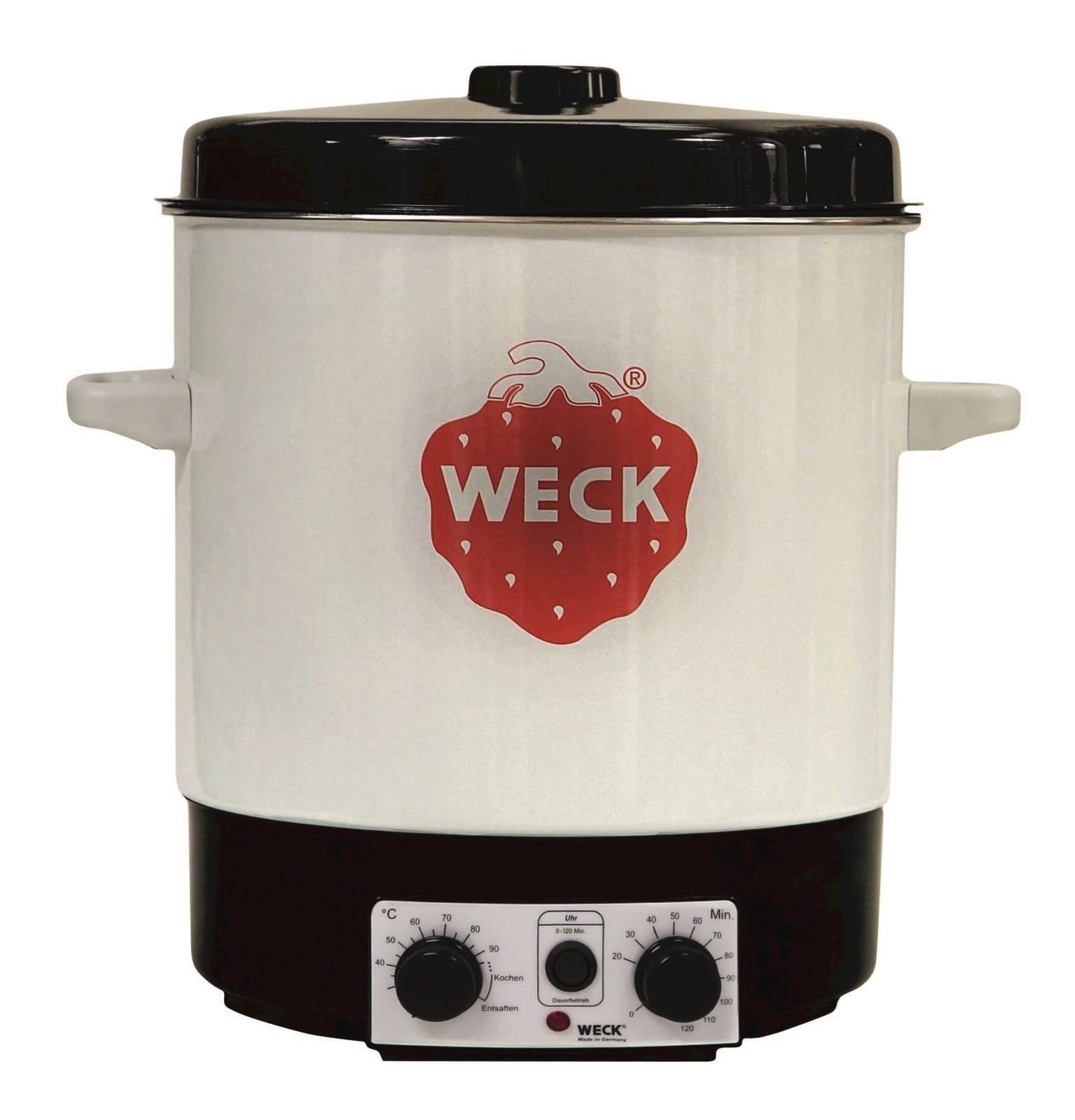 Weck. Mit Thermostat, Timer, Einlegerost und Deckel. Emaillierter Topf. Leistung: 2000 W.