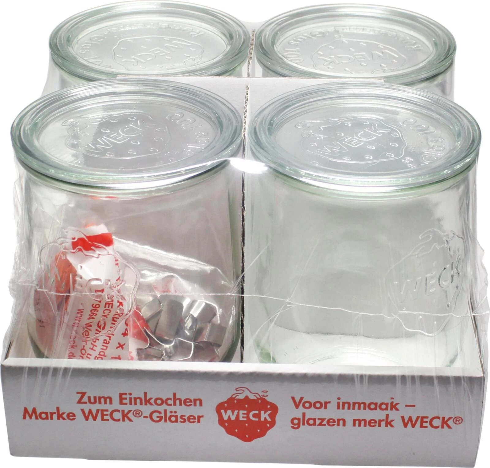Weck. Mit 4 × Gummiringen, 8 × Klammern und 4 × Deckeln. Masse Deckel: 11 cm. Masse Glas: 11 × 14,6 cm.