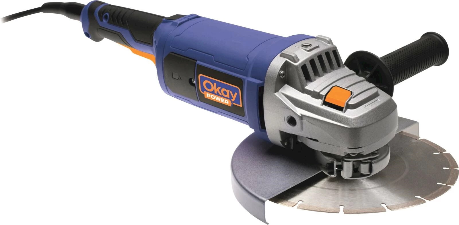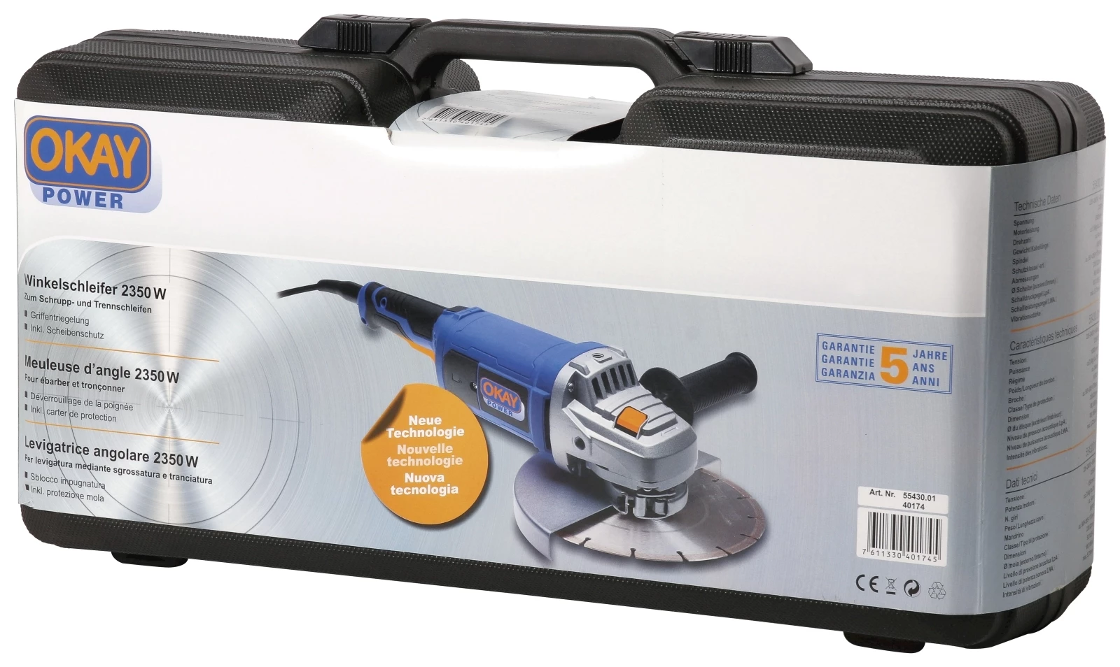 Der Winkelschleifer Okay Power E 2200 kann für Trenn- oder Schleifarbeiten von Metall und Fliesen etc. eingesetzt werden. Er verfügt über eine Spindel von 14 mm. Der Scheibendurchmesser innen beträgt 22 mm, der Durchmesser aussen liegt bei 230 mm. Die Trennscheibe ist nicht im Lieferumfang enthalten. Das Gewicht des Winkelschleifers liegt bei ca. 7,6 kg. Die Garantiedauer des Winkelschleifers beträgt 5 Jahre.