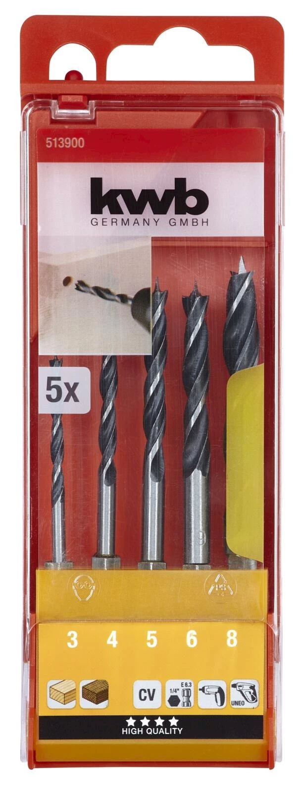 Der Holzbohrersatz dient präzisen Bohranwendungen in verschiedenen Holzarten. Hergestellt aus hochwertigem CV-Stahl und ausgestattet mit einer Sechskantaufnahme von 1/4" nach ISO 1173, E 6.3, bieten diese Holzspiralbohrer eine optimale Lösung für verschiedene Akkuschrauber, Bohrmaschinen und Bithalter mit entsprechender Aufnahme. Mit einer Zentrierspitze und zwei Vorschneidern ausgestattet, garantieren diese Bohrer präzise und ausrissfreie Bohrungen in Weich- und Hartholz.